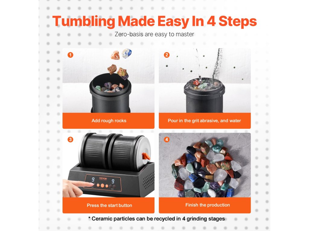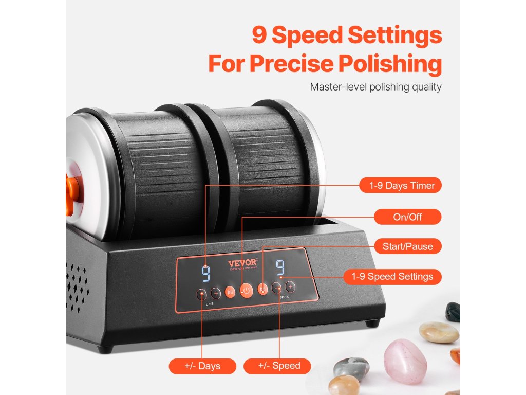 Válasszon 9 pontos, a polírozás egyes fázisaihoz igazított sebességbeállítás közül, akár 9 napos időzítővel. Egyszerűen állítsa be a kőpolírozót, és hagyja futni, így időt szabadít fel más tevékenységekre.