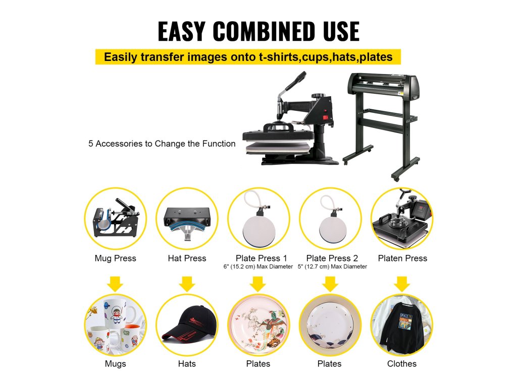 Ez a teljes készlet két professzionális berendezésből áll, nevezetesen egy vinilvágóból és egy többfunkciós hőprésből. a 34"-os vágó plotter lehetővé teszi, hogy egyedi mintákat és jeleket faragjon tetszése szerint. az 5 az 1-ben hőlégprés tökéletesen alkalmas a személyre szabott képek pólókra, bögrékre, sapkákra stb. történő átvitelére.