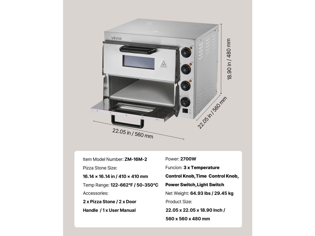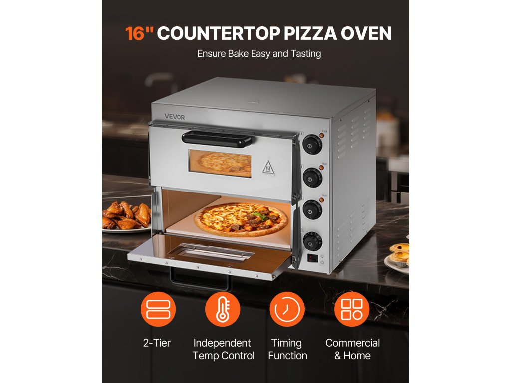 A VEVOR 16 hüvelykes elektromos pizzasütő büszkélkedhet élelmiszeripari minőségű rozsdamentes acélszerkezettel, pontos hőmérséklet-szabályozással 122-662℉/50-350 ℃. A nagy teljesítmény és a három fűtőcső egyenletes és hatékony hőeloszlást biztosít a tökéletes sütési eredményekért minden alkalommal!