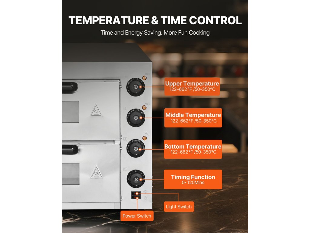 Élvezze a hőmérséklet és a főzési idő teljes szabályozását 4 különálló gombbal. Kézzel állítsa be a hőmérsékletet 122°F és 662°F (50-350 ℃) között, és válassza ki a kívánt sütési időt 0 és 120 perc között, így teljes rugalmasságot biztosít.