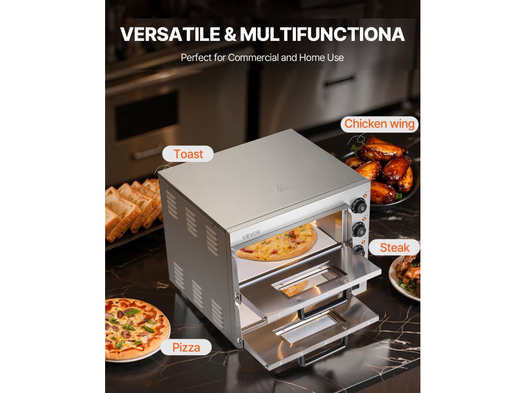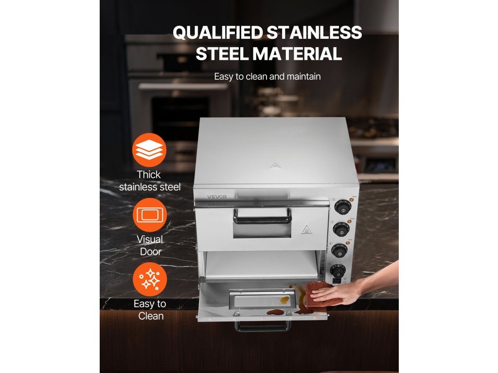 Az élelmiszeripari rozsdamentes acélból készült VEVOR kereskedelmi pizzasütő nemcsak tartósságot, hanem egészséges sütési környezetet is garantál. Emellett a tapadásmentes belső anyag lehetővé teszi a problémamentes tisztítást és a szórakoztató sütést.