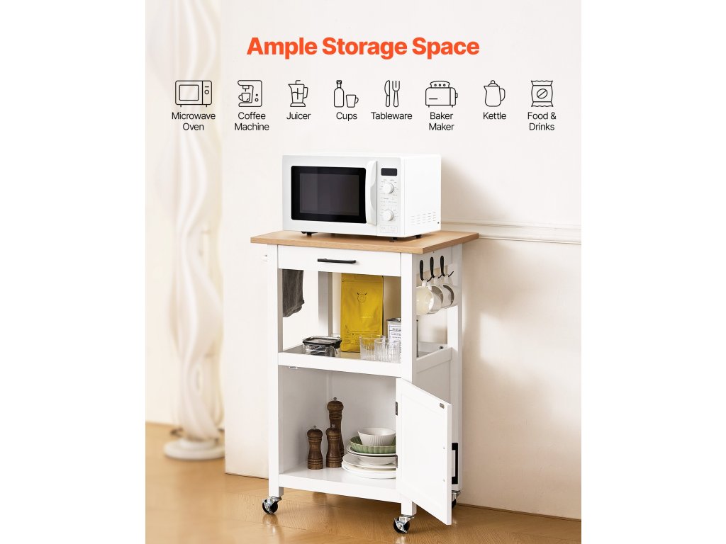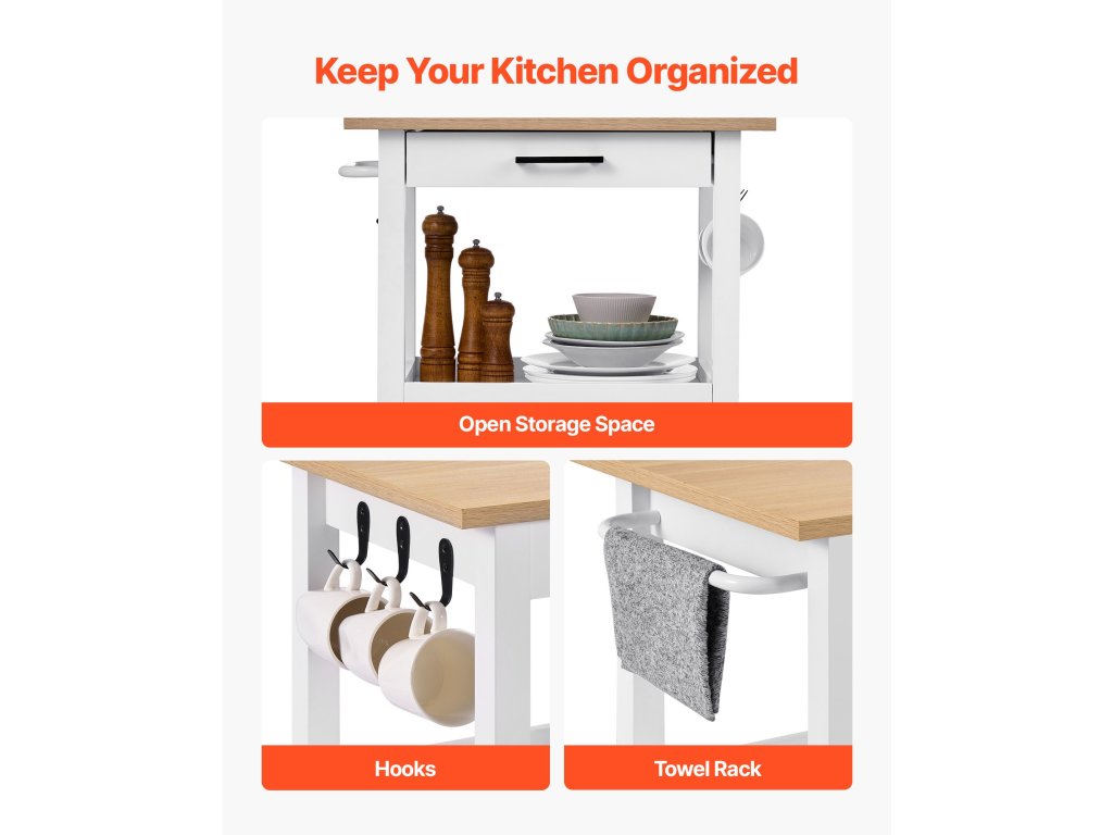 Ez a sokoldalú sziget állványokat, polcokat és szekrényeket kombinál, hogy könnyedén rendszerezze a konyhai eszközöket, használati tárgyakat és az éléskamra alapvető kellékeit. A sima futású görgők könnyedén siklanak a padlón, így a konyhapultról az étkezőbe vagy akár a szabadtéri grillezőhelyre is áthelyezheti a berendezéseket.