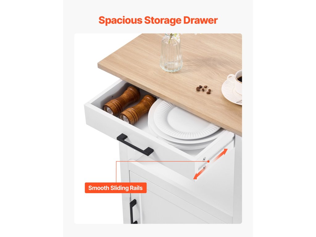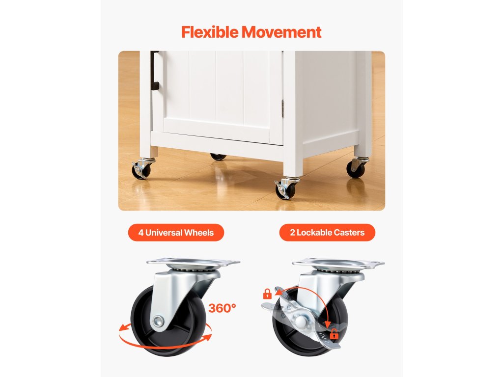 Konyhai tárolószigetünk zárható görgőkkel rendelkezik, amelyek lehetővé teszik a zökkenőmentes áthelyezést és a biztonságos elhelyezést, így alkalmazkodni tud a dinamikus konyhai elrendezéshez, miközben használat közben megőrzi stabilitását.