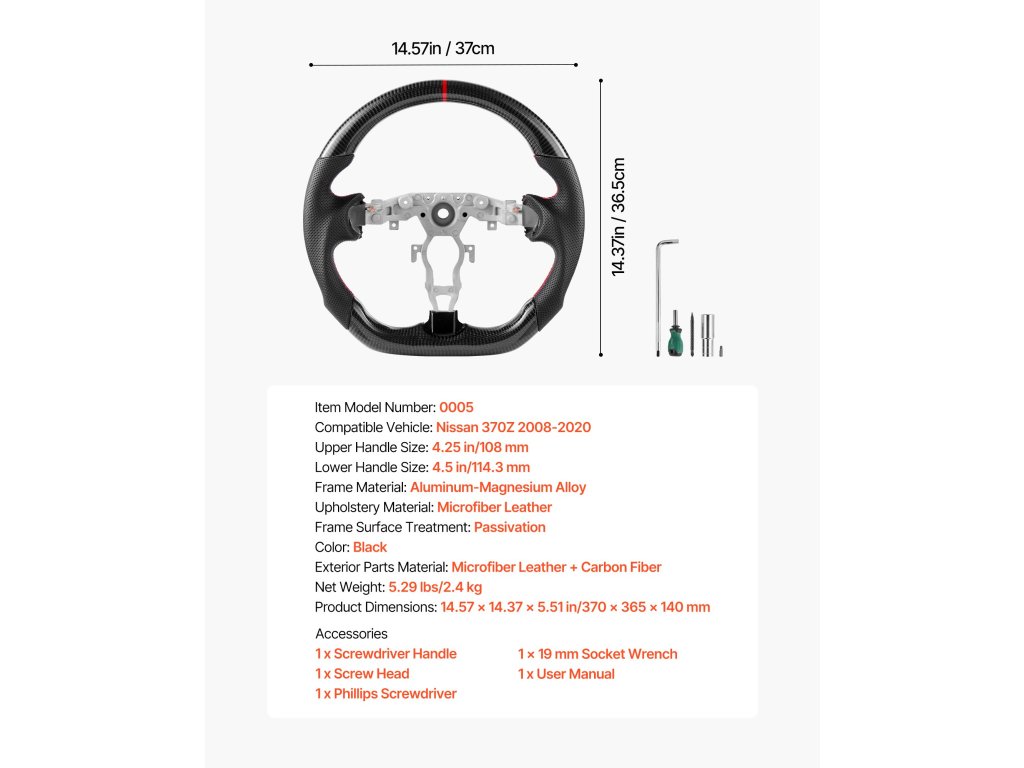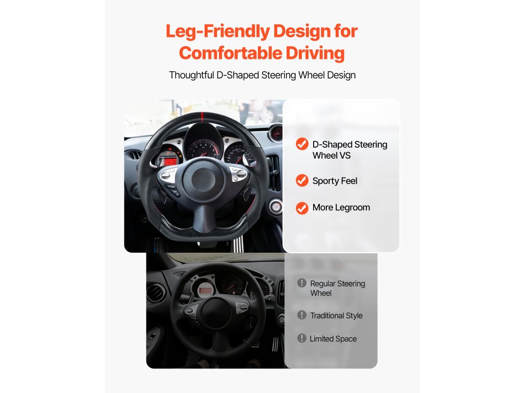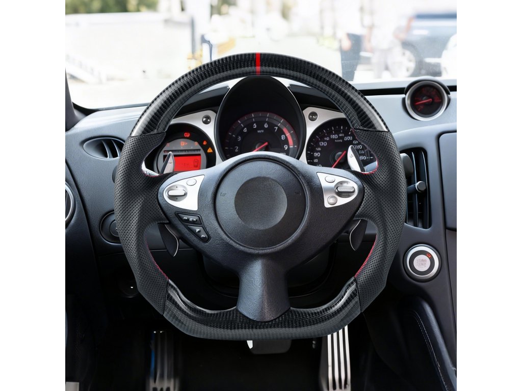 A 2008-2020-as Nissan 370Z modellhez tervezett kormánykerék pontosan illeszkedik járművéhez, és javítja a kezelhetőséget és a vezetési kényelmet. Bőrből és szénszálból készült, D-alakú kialakítása csúszásmentes textúrával biztosítja a magabiztos és kényelmes vezetést.