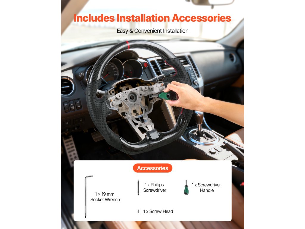 Ezt a lapos aljú kormánykereket négy egyszerű lépésben szerelheti fel: 1) szerelje le a széria kormánykereket; 2) szerelje le az eredeti alkatrészeket; 3) szerelje fel az eredeti alkatrészeket az új kormánykerékre; 4) szerelje fel az új kormánykereket. Nincs szükség különleges képességekre - percek alatt elvégezhető a frissítés.