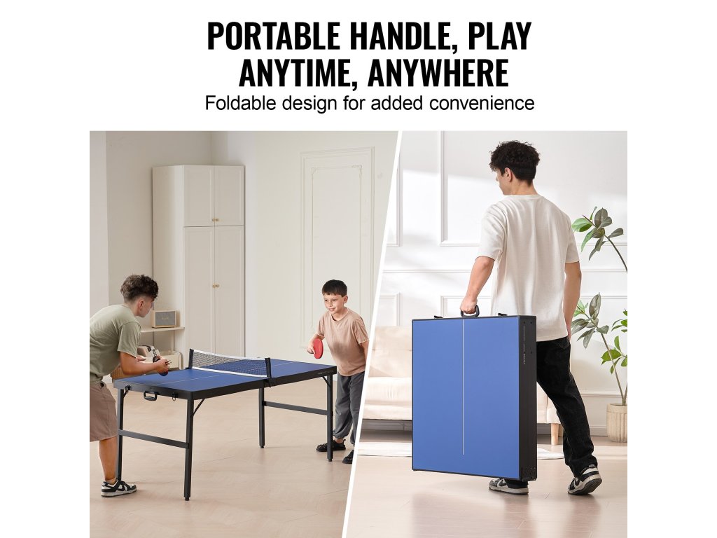 Ez a beltéri hordozható pingpongasztal másodpercek alatt összecsukható a tároláshoz, és a beépített fogantyú segítségével egy személy is könnyen hordozhatja.
