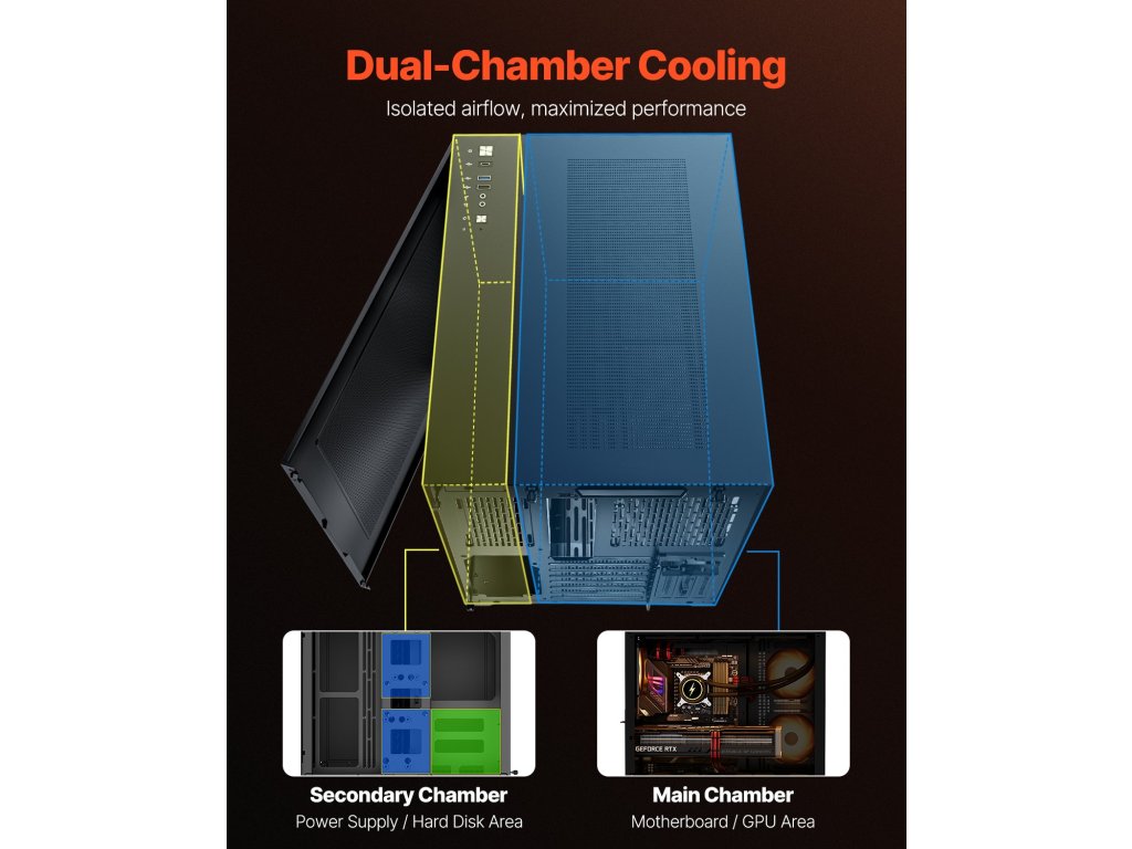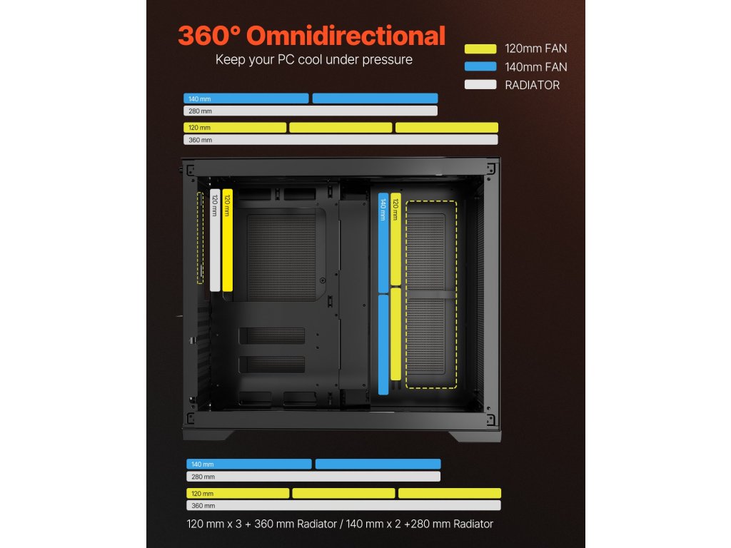 A prémium SPCC acélból és edzett üvegből készült PC tok ATX alaplapokhoz készült. Akár 9 x 120 mm-es vagy 6 x 140 mm-es ventilátort is támogat, így még nagy terhelés esetén is optimális hűtést biztosít. Akár 4 merevlemez (2 HDD és 2 SSD) számára biztosít helyet, így minden tárolási igényt kielégít.