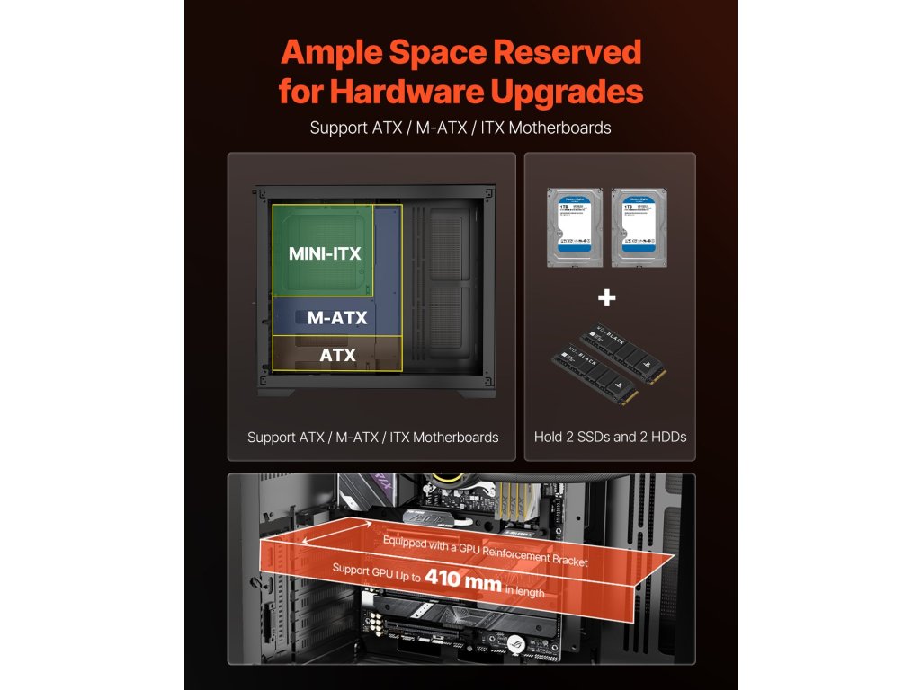Válasz: A test 0,8 mm vastag SPCC acélból készült, megerősített sarkokkal és ütésgátlóval a további védelem érdekében. Az egyik oldalsó panel edzett üvegből készült, így nagyjából kétszer olyan ütésálló, mint a hagyományos tokok.