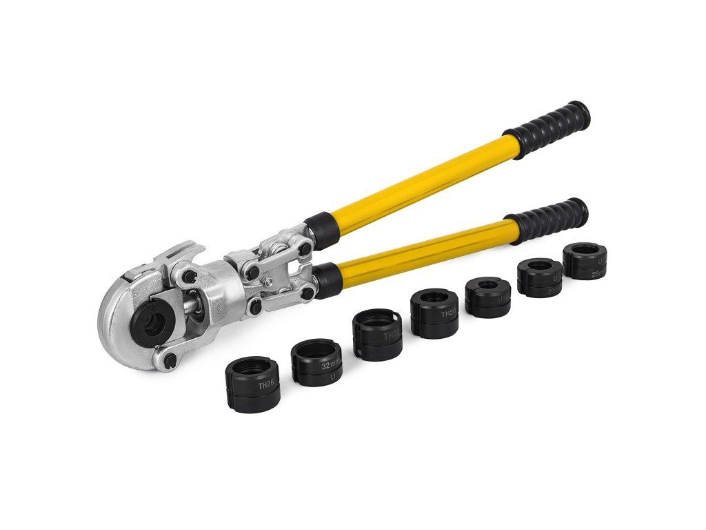 Különböző méretű, cserélhető rézpofákkal szállítva (mindegyik: U16, U20, U25, U32, TH16, TH20, TH26 és TH32 mm), amelyek alkalmasak a legtöbb réz/cső préselési munkához. A fej könnyen nyitható, a pofák könnyedén cserélhetők.