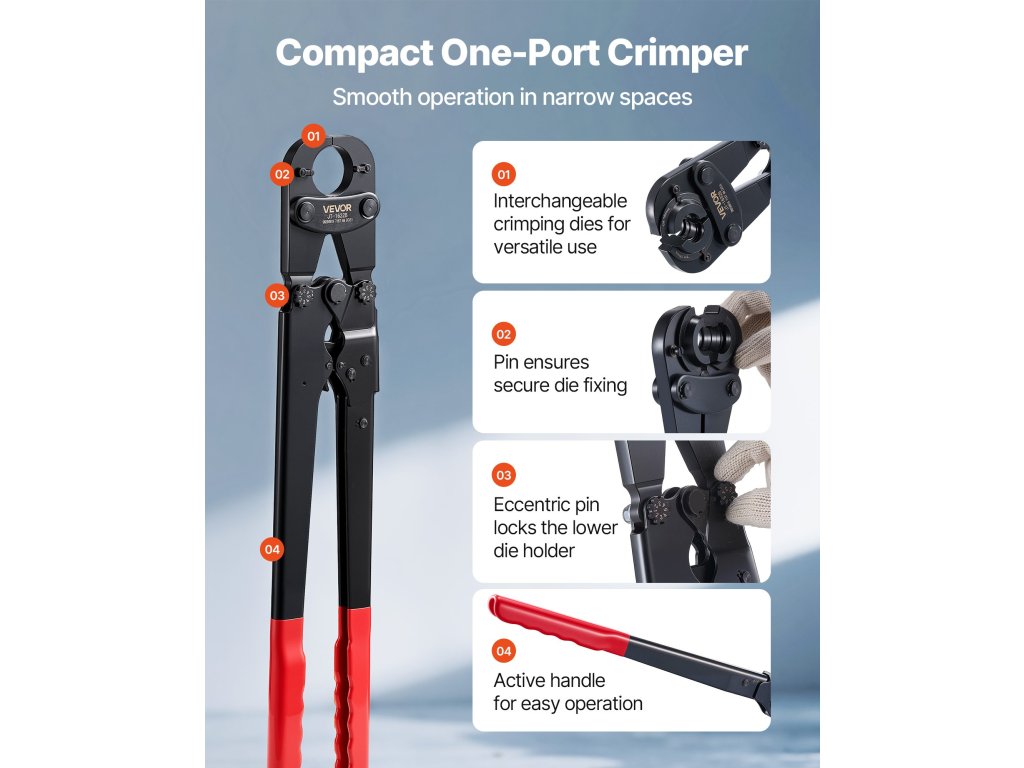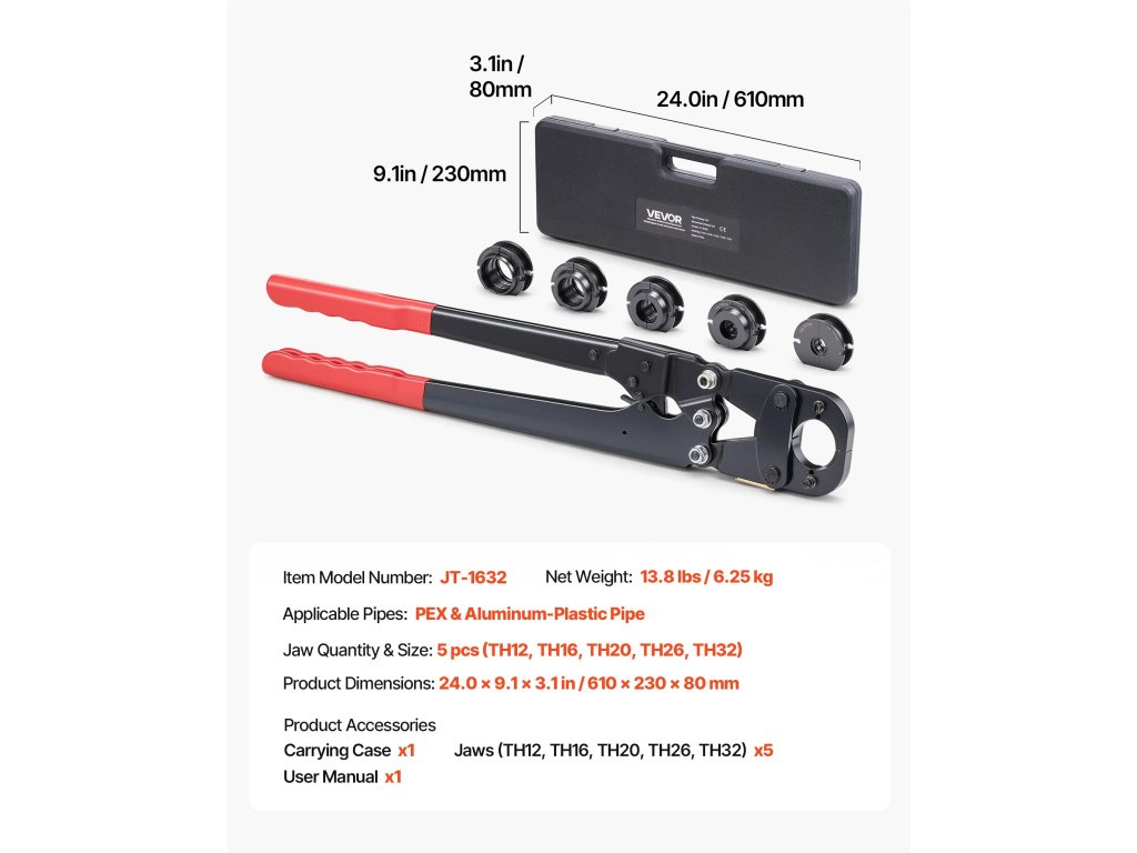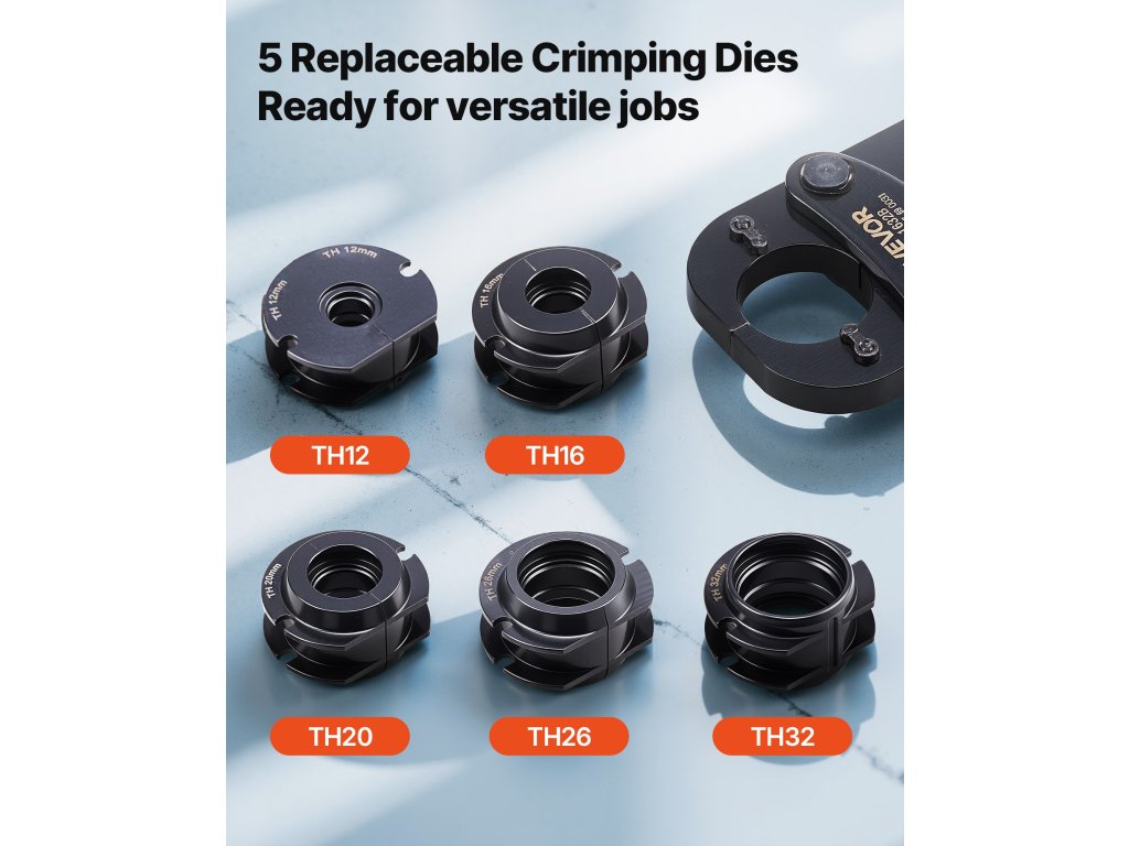 A VEVOR egynyílású krimpelőszerszámot 5 cserélhető krimpelőpofával (TH12, TH16, TH20, TH26, TH32) szállítjuk PEX és alumínium-műanyag csövekhez. A nagy szilárdságú pofáknak és az alapos kialakításnak köszönhetően gyors, hibamentes krimpelést és biztonságos kötéseket biztosít a különböző csőalkalmazásokhoz.