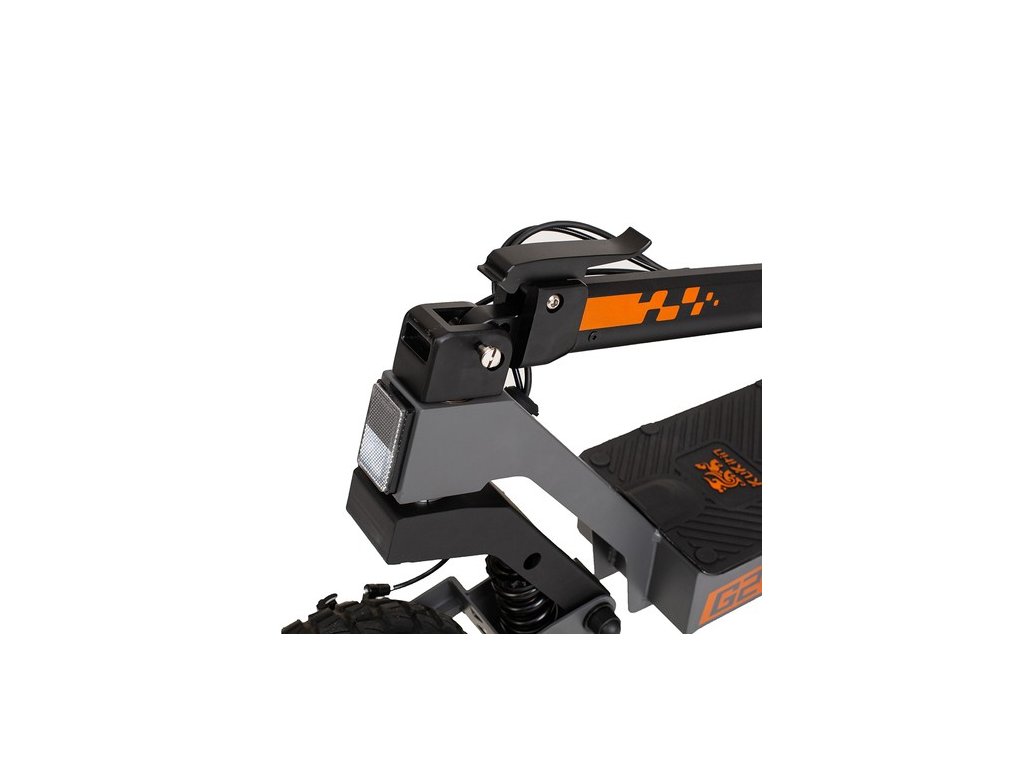 A KuKirin G2 összecsukható elektromos robogó gondosan megtervezett egygombos gyors összecsukó mechanizmussal rendelkezik, amely néhány egyszerű lépésben képes a robogó összecsukását és kibontását elérni. Miután összecsukta, helyezze a féknyerget elöl az alsó lemez köré, ahol a hátsó lámpa található, hogy szilárdan rögzítse a vázat, megakadályozza a véletlen kibontást szállítás közben, és biztosítsa a felhasználó biztonságát és stabilitását a szállítás során. A kiváló összecsukószerkezetet szigorúan tesztelték, és még gyakori összecsukás esetén sem lazul meg könnyen, így a felhasználóknak hosszú ideig kényelmes élményt nyújt.