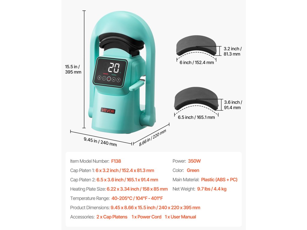 Ez az automatikus kalapprés nagyvonalú, 6 x 3,54 hüvelykes fűtőlemezzel rendelkezik, amely könnyen beállítható bármely kalap átviteli területéhez. A baseballsapkáktól a barettig minden alkalommal pontos és élénk nyomatokat érhet el, hogy megfeleljen minden barkácsolási igényének.