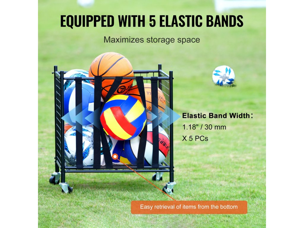 Ez a sportlabda tárolókocsi egyedi kialakítású, ajtóként gumiszalaggal ellátott. Nemcsak a tárgyak kényelmes kivételét teszi lehetővé az aljáról, hanem segít a sportlabdák rögzítésében is, megakadályozva, hogy azok guruljanak, rázódjanak vagy csúszkáljanak a ketrecben.