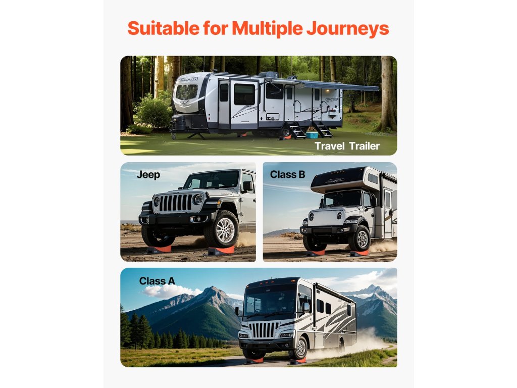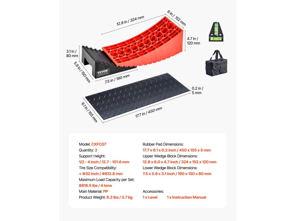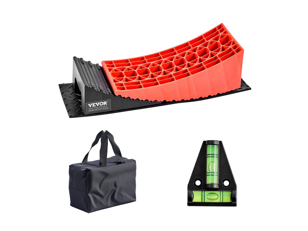 A lakóautó szintező készletünk két ívelt lakóautó szintezőt és egy vízmértéket tartalmaz, hogy járművét stabilan tartsa egyenetlen talajon. Mindegyik lakóautó szintező készlet 8818,5 fontot (4 tonna) bír el, és legfeljebb 32 hüvelykes méretű gumiabroncsokhoz alkalmas. A tartós, csúszásmentes konstrukció segít megelőzni a gumiabroncsok sérülését, és kerékbilincsként is használható.