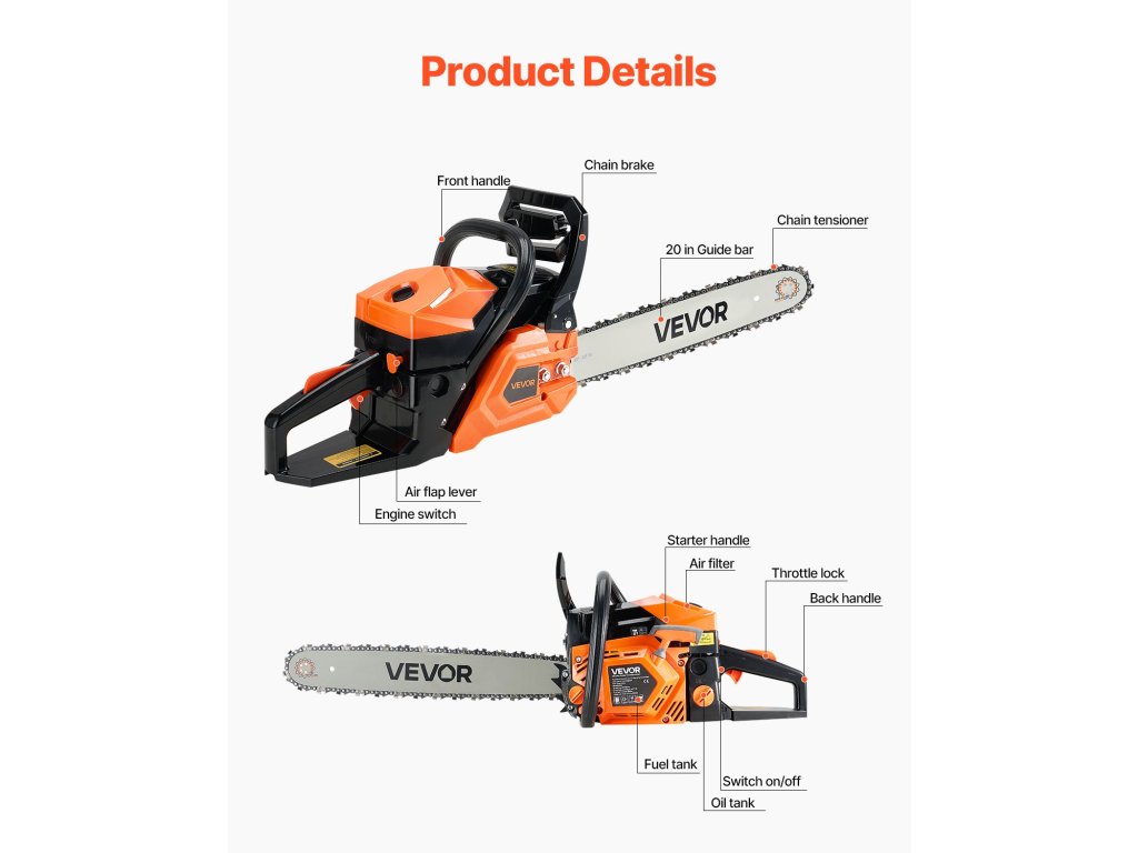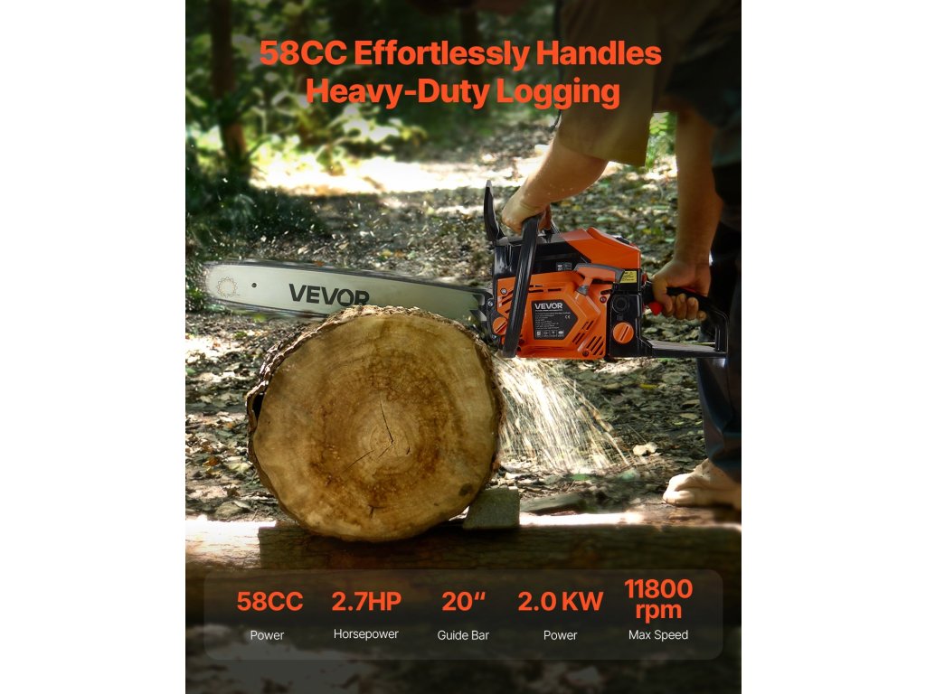 Ez az 58 köbcentiméteres, gázüzemű láncfűrész 2,7 LE (2 kW) teljesítményű motorral rendelkezik, amelynek maximális fordulatszáma 11800 fordulat/perc, és 508 mm (20 hüvelyk) átmérőjű vezetőrúddal, amely akár 455 mm (18 hüvelyk) átmérőjű vágásokat is végez. A PA6+30%GP teste tartós és szivárgásmentes, hosszú élettartamú 550 ml-es üzemanyagtartállyal és 260 ml-es olajtartállyal rendelkezik.