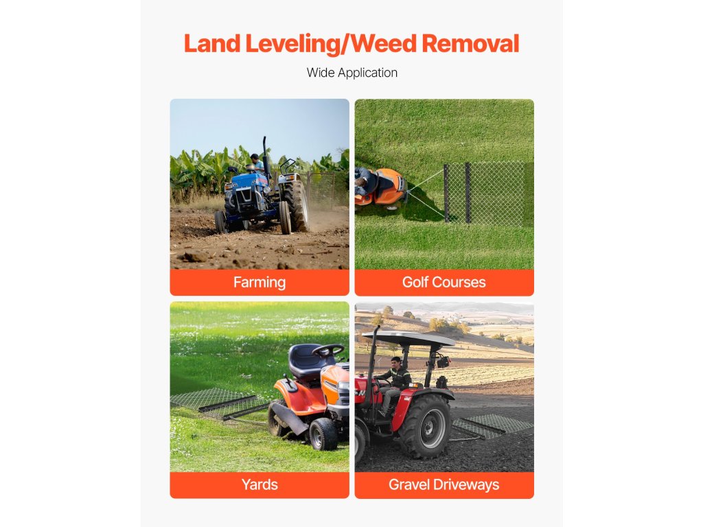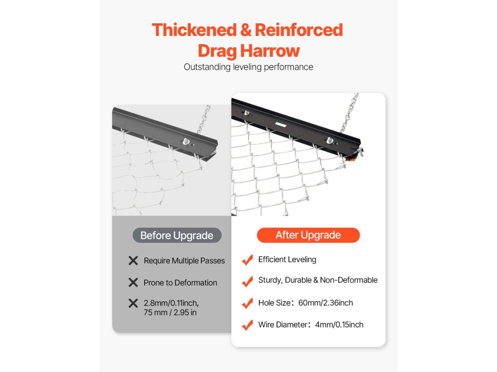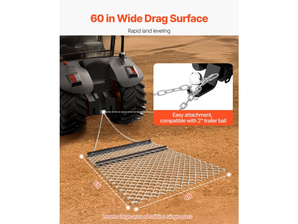 Ez a Q235 acélból készült vontatókapu nagy felületének (59,84 x 48,82 hüvelyk / 1520 x 1240 mm) köszönhetően gyorsan kiegyenlíti a talajt. Ideális mezőgazdasági munkákhoz, udvari munkákhoz és felhajtási útegyengetési feladatokhoz, tartósan készült, és könnyen rögzíthető egy univerzális vonóhoroggal.