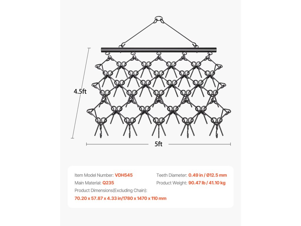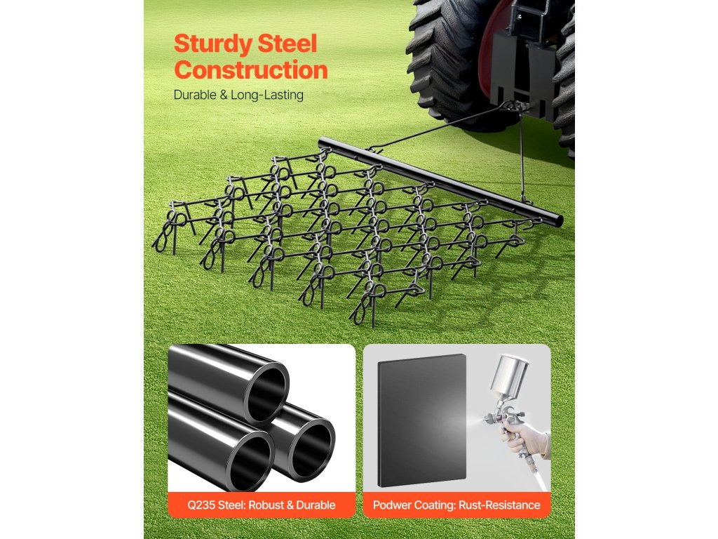 A korrózióálló Q235-ös acélból készült, 60 fogú vontatókapu a mély talajműveléshez. Nagy mérete (5 x 4,5 láb) felgyorsítja a szintezést, az univerzális vonóhorog pedig leegyszerűsíti a rögzítést. Ideális gazdaságokba, udvarokra, sportpályákra és egyéb célokra.