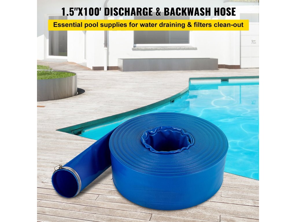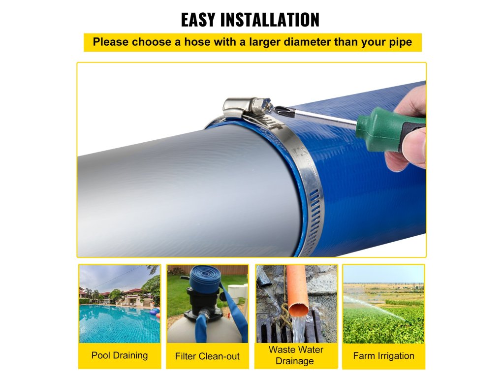 A medence-visszaöblítő tömlőt 2 rozsdamentes acél bilinccsel szállítjuk a könnyű felszerelés érdekében. Zökkenőmentesen csatlakoztatható 2 in csőhöz, vízszivárgás nélkül.