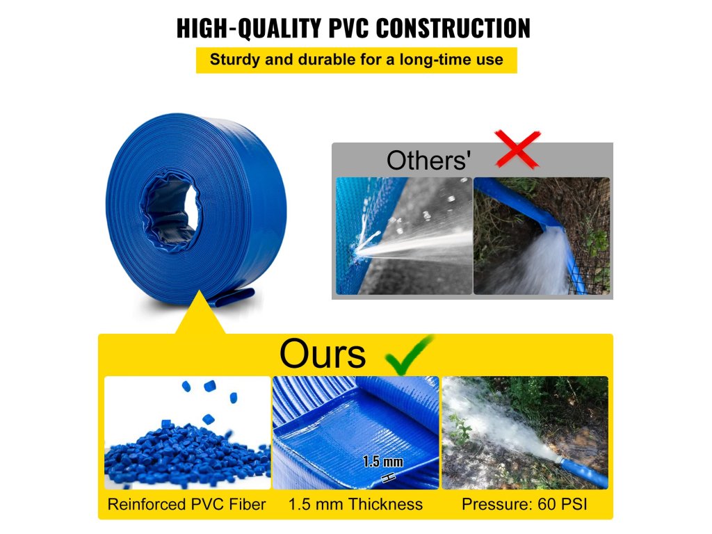 A nagy teherbírású visszaáramlásgátló tömlő extra erős 0,06 hüvelykes/1,5 mm-es PVC anyagot használ, amely tartósságot biztosít, ugyanakkor rugalmas a könnyű használat érdekében.
