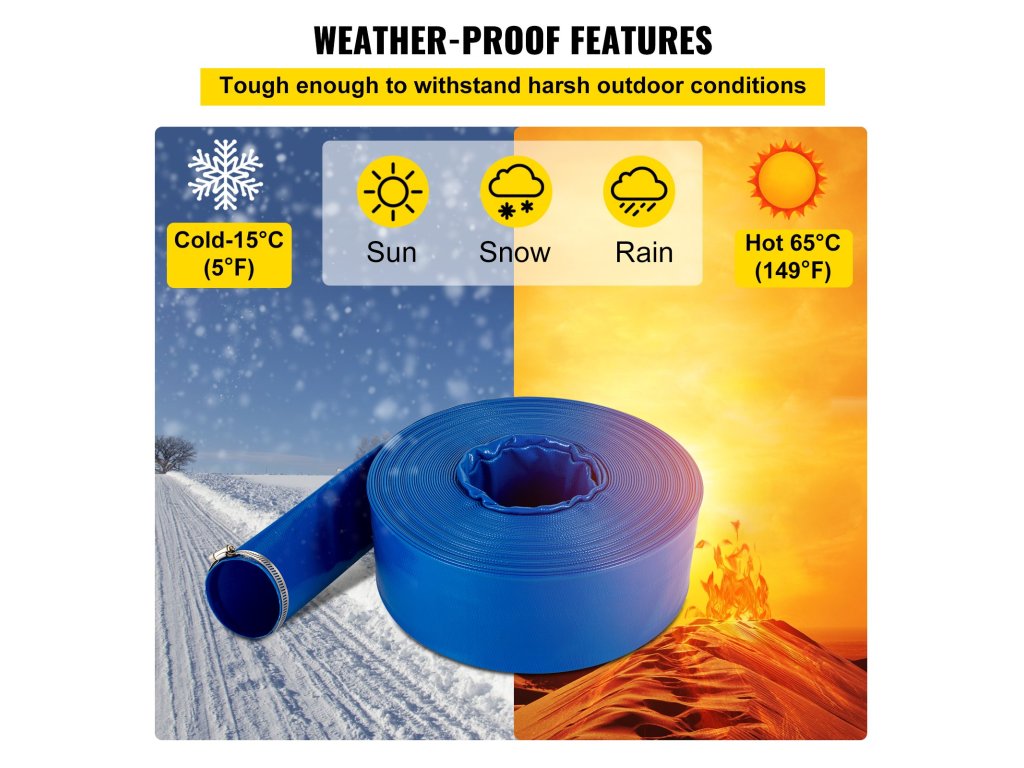 A lapos tömlő elég tartós ahhoz, hogy ellenálljon a szélsőséges időjárási körülményeknek, függetlenül a perzselő nyári naptól vagy a fagyos hótól, hőmérséklettartomány: 5°F - 149°F (-15°C - 65°C).