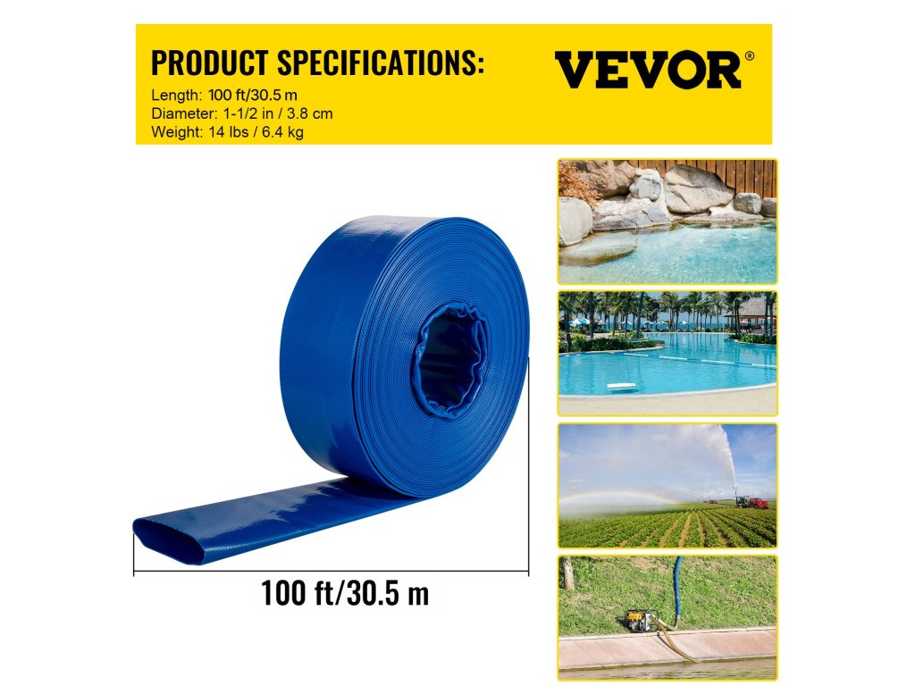 A lefolyótömlő legfeljebb 1-1/2 hüvelykes csőhöz illeszkedik, a tömlő belső átmérője: 1-1/2 hüvelyk/38 mm, lapos szélessége: 2-1/2 hüvelyk/63 mm, hossza: 105 láb/32 m.