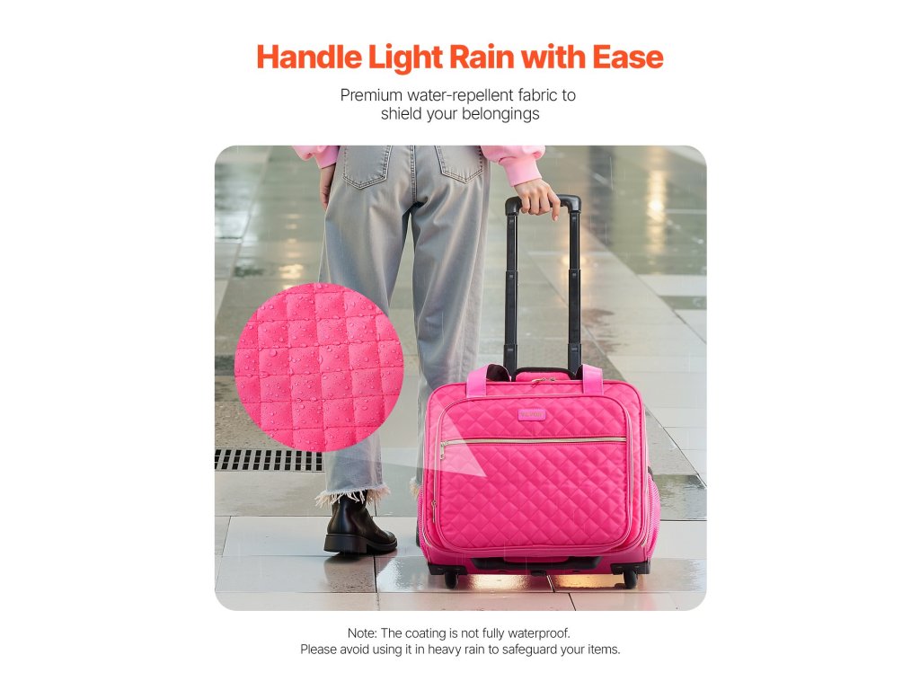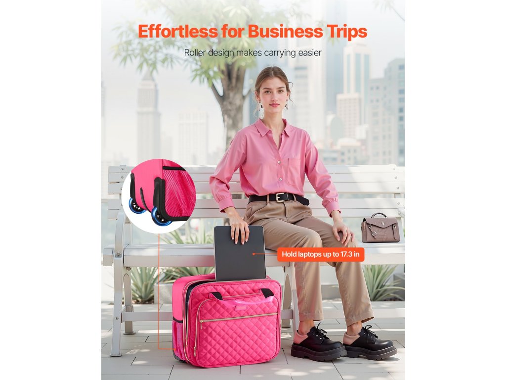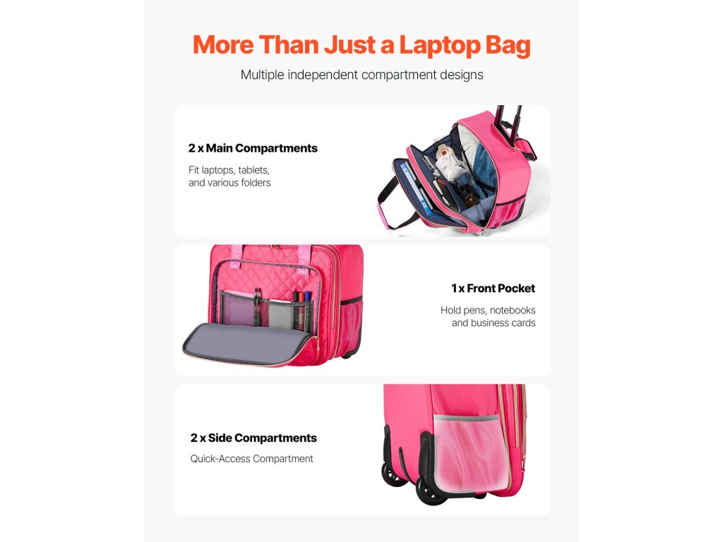 Ez a kerekes laptop táska 17,3 hüvelykes laptopok számára alkalmas, és 4 magasságú teleszkópos fogantyúval rendelkezik a könnyű utazás érdekében. Több rekesszel és egy gyorsan hozzáférhető zsebbel rendben tartja az alapvető dolgokat. Tartós 290PVC kompozit anyagból készült, vízálló kivitelben, így megvédi holmiját a könnyű esőtől.