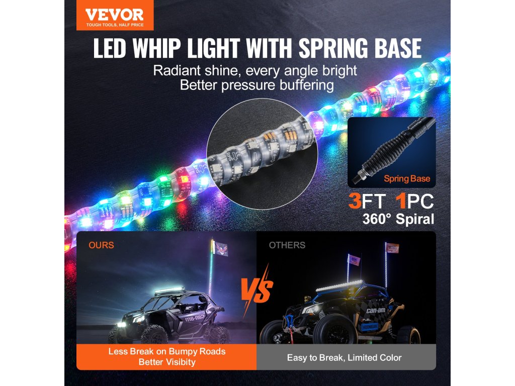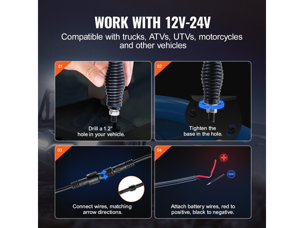 Ideális DC12V-24V-os járművekhez, beleértve az UTV-ket, ATV-ket, motorkerékpárokat, RZR-eket, Can-amokat, teherautókat, terepjárókat és gokartokat. Ostorlámpánk biztosítja, hogy járműve a legfényesebb jelenlétet mutassa az éjszakai vezetések és terepjáró kalandok során.