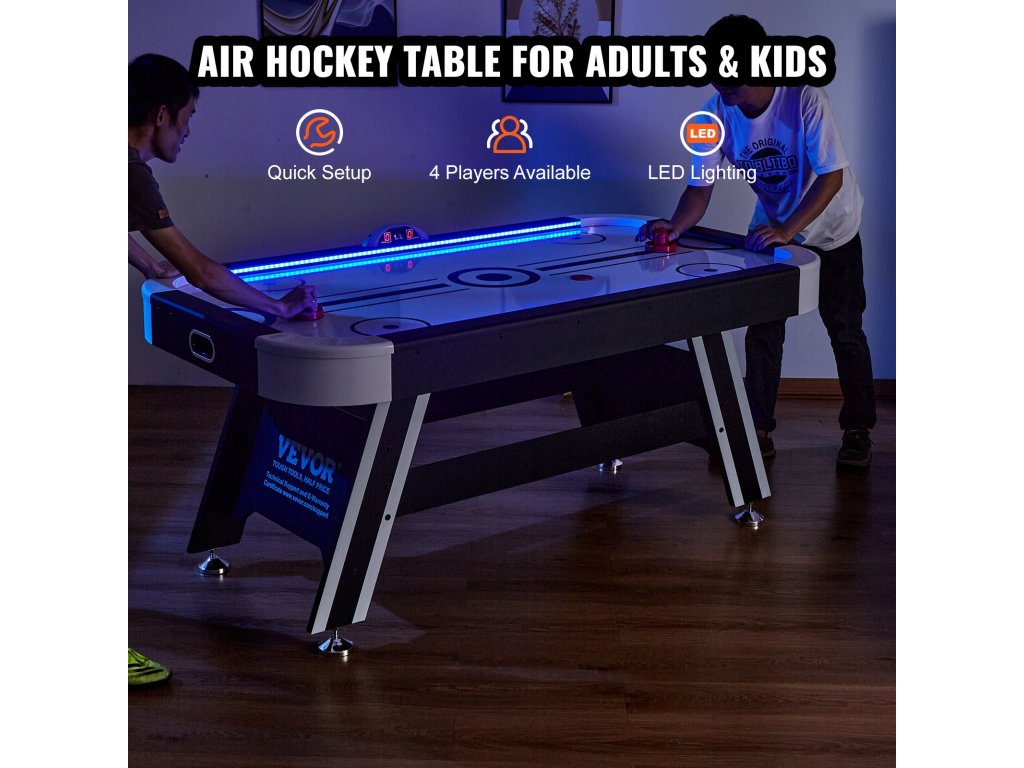 Ez a léghokiasztal a beépített LED-es fénycsíkoknak köszönhetően ragyog, és élénk és magával ragadó hangulatot biztosít a játék során. A 4 játékos mérkőzéséhez tervezett asztal világítása fokozza a játék élményét, különösen akkor, ha a szoba világítása le van tompítva, ami még izgalmasabbá teszi a játékot.