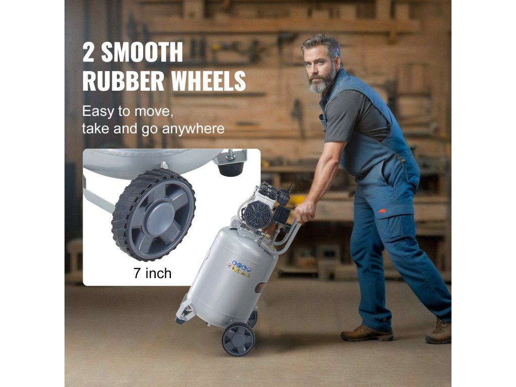 A kényelmet szem előtt tartva tervezett elektromos légkompresszorunk 7 hüvelykes gumikerekekkel van felszerelve a problémamentes mobilitás érdekében, és készen áll a különböző munkakörnyezetek kezelésére. Kompakt kialakításának köszönhetően nem foglal helyet, így még szűk munkaterületeken is könnyen tárolható.