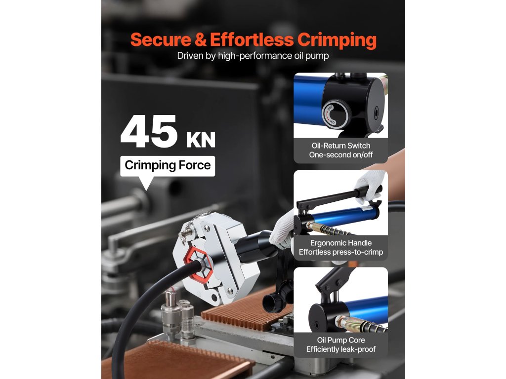 Ez a nagy szilárdságú cinkötvözetből készült hidraulikus AC tömlő krimpelő szerszám nagy üzemi nyomást bír ki deformáció nélkül. Kopás-, korrózió- és rozsdaálló szerkezete hosszú távú megbízhatóságot biztosít.