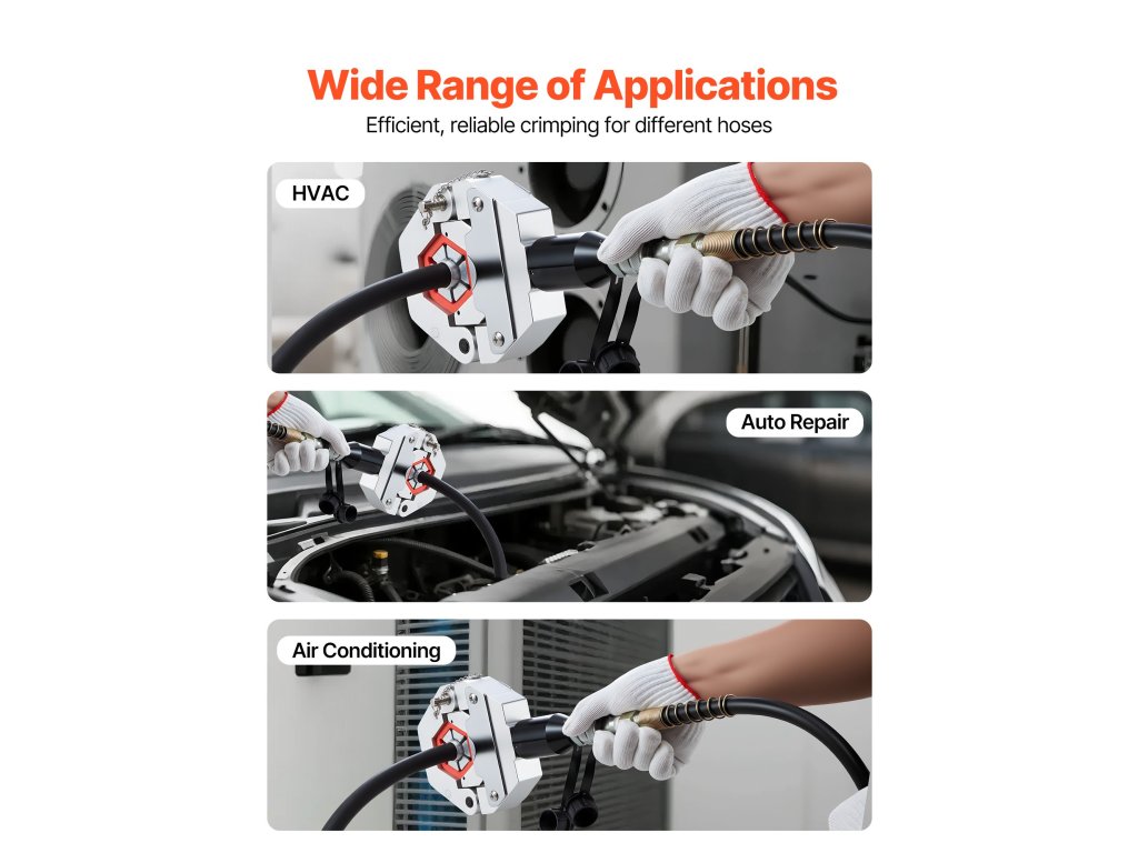 Ez a hidraulikus légkondicionáló tömlő krimpelő készlet erős, pontos és szivárgásmentes krimpelést biztosít különböző méretű tömlőkhöz. A 7 krimpelőszerszámmal, precíziós hidraulikus rendszerrel és robusztus testtel rendelkező készlet ideális autójavításhoz, HVAC-szereléshez és légkondicionáló karbantartáshoz.