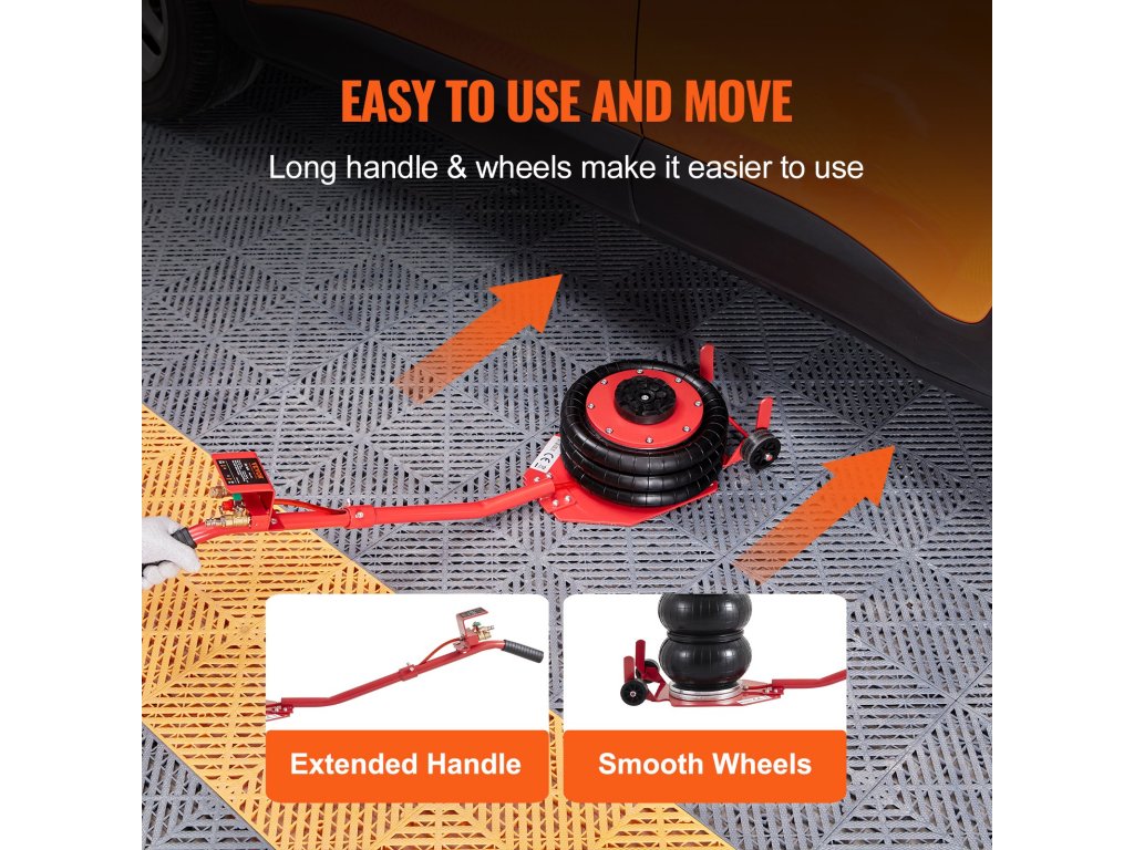 A légzsákos emelő hosszú fogantyúval és két kerékkel rendelkezik a zökkenőmentes manőverezés érdekében, lehetővé téve, hogy az emelőt a jármű alá helyezze anélkül, hogy megerőltetné a hátát.