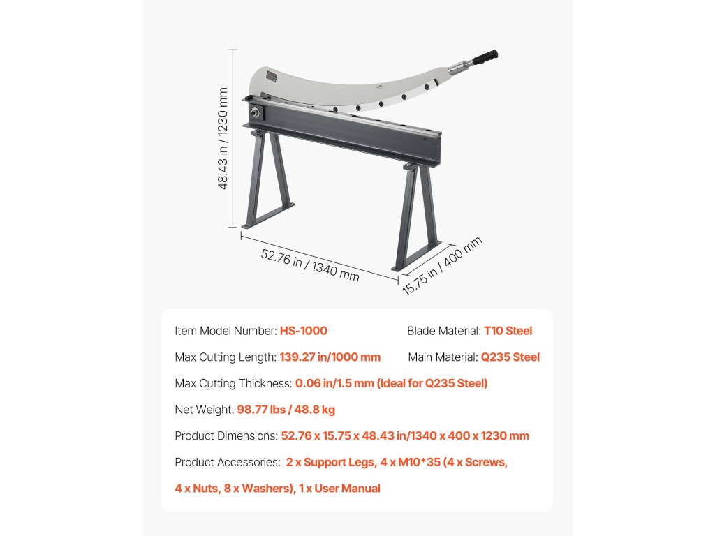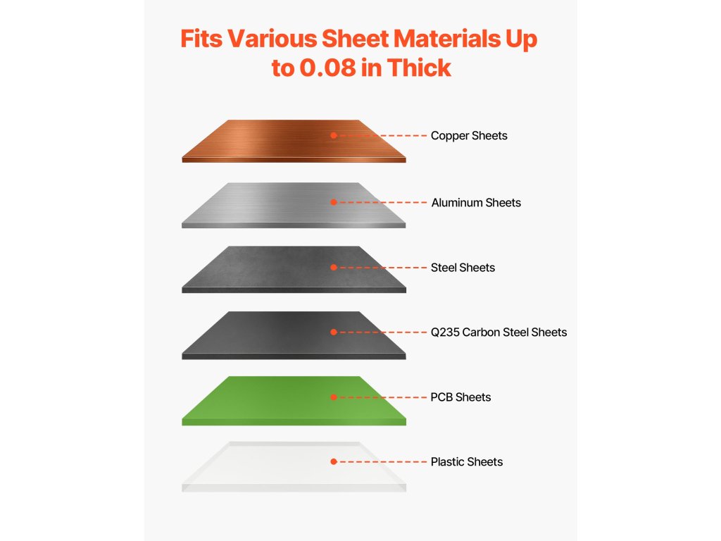Ezek a lemezollók ideálisak alumínium, rozsdamentes acél és alacsony széntartalmú acél vágására. T10-es acél pengékkel és kör alakú pengével rendelkezik, amelynek maximális vágási hossza 39,27 hüvelyk, vastagsága 0,06 hüvelyk, és 0,06 hüvelyk kapacitású kerek acélon. A <0,07 mm-es hézag biztosítja a pontos, marásmentes vágást.
