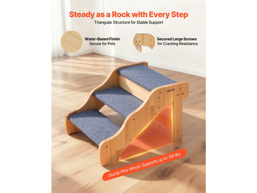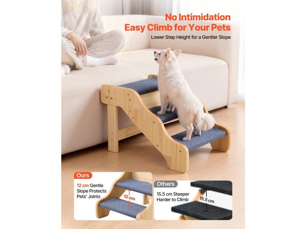 a 3 szintes kialakítás segít minden méretű háziállatnak, különösen az idősebb, sérült vagy mozgáskorlátozott háziállatoknak, hogy biztonságosan feljussanak az ágyakra és kanapékra. A masszív konstrukció támaszt nyújt, míg a könnyű kialakításnak köszönhetően könnyen mozgatható. Letisztult, egyszerű kialakítása tökéletesen illeszkedik bármilyen enteriőrbe.