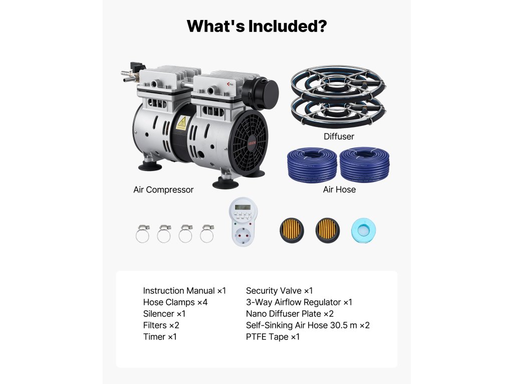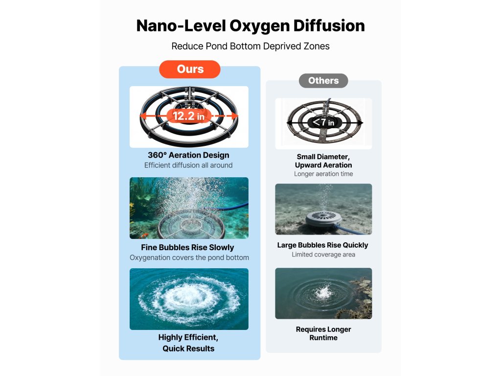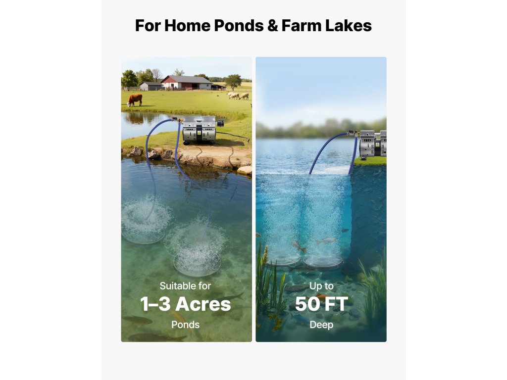 Ez a tószellőztető készlet 1-3 hektár méretű és 50 láb mély tavakban használható. Gyorsan összeszerelheti, hogy növelje az oldott oxigént, javítsa a vízminőséget, csökkentse az algásodást és korlátozza az iszapfelhalmozódást, hogy a halak és a tó jobban "lélegezzen".