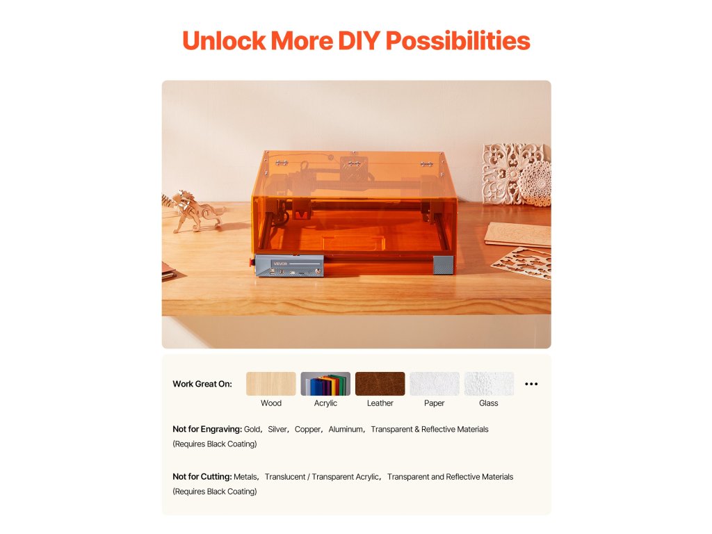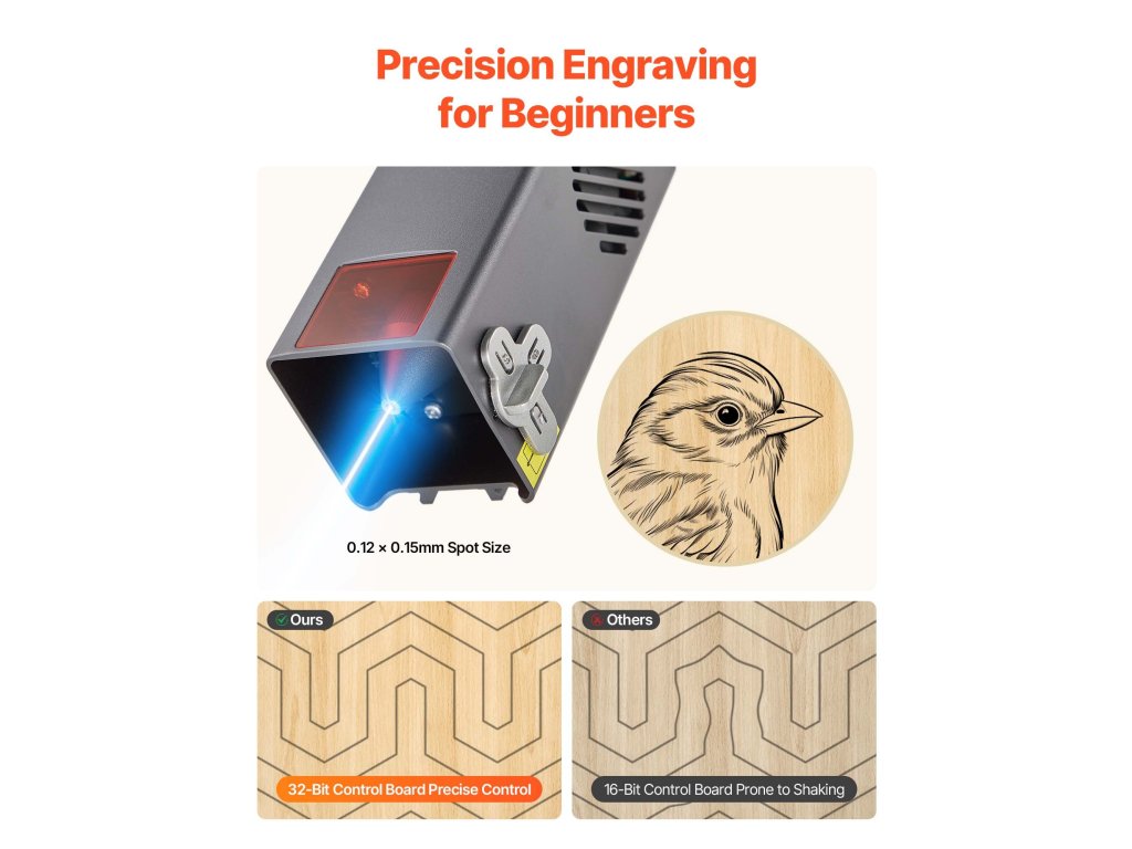 Engedje szabadjára kreativitását a 11,8 x 11,8 hüvelykes munkaterülettel és a 7000 mm/perc gravírozási sebességgel. Vágjon át 0,3 hüvelykes hársfát egy menetben, és érjen el finom részleteket a 0,12 x 0,15 mm-es kék lézerpont segítségével. Az 1. osztályú lézerkialakítással rendelkező készülék támogatja a LaserGRBL, a LightBurn (fizetős) és a CutLabX APP alkalmazást.