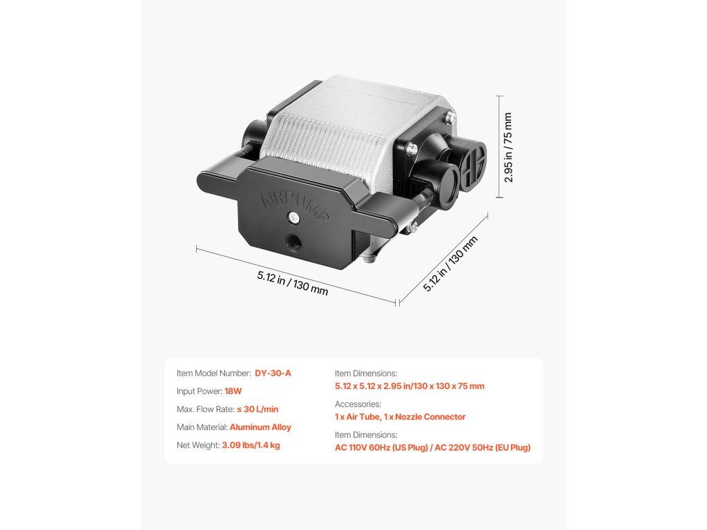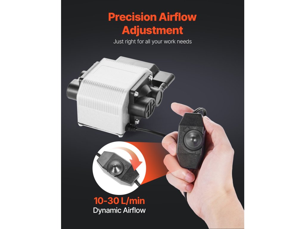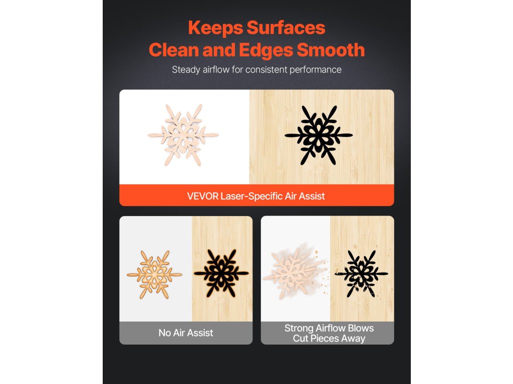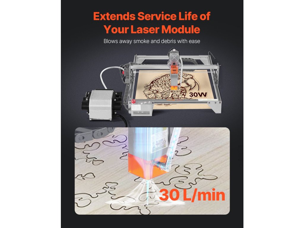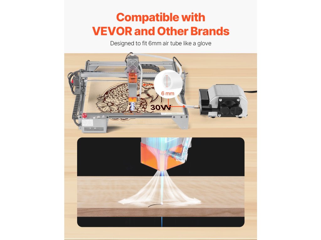 Ez a légszivattyú könnyedén elfújja a füstöt és a törmeléket, meghosszabbítva ezzel a lézermodul élettartamát. A 30 l/perc állítható légáram csökkenti a felületi hőmérsékletet, így biztosítva a tiszta vágóélességet. Kompatibilis a VEVOR és más márkájú lézergravírozó gépekkel. Alkalmas minden gravírozási munkához.