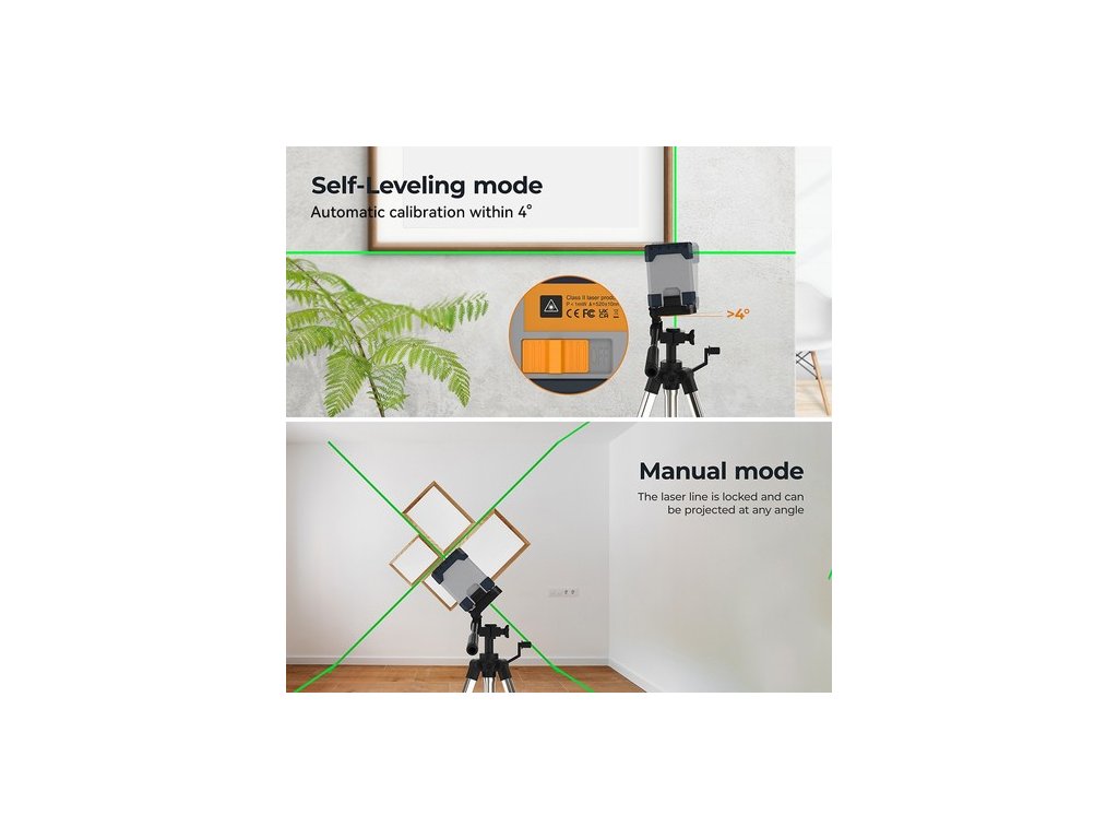 Amikor az ingát feloldja, a lézeres szintező automatikusan 4 fokos pontossággal igazodik (ellenkező esetben a lézersugár folyamatosan villog). Ha a lézert egy bizonyos szögben kell rögzítenie, akkor kézi üzemmódra válthat, hogy megfeleljen a különböző szögeknél felmerülő igazítási igényeknek.