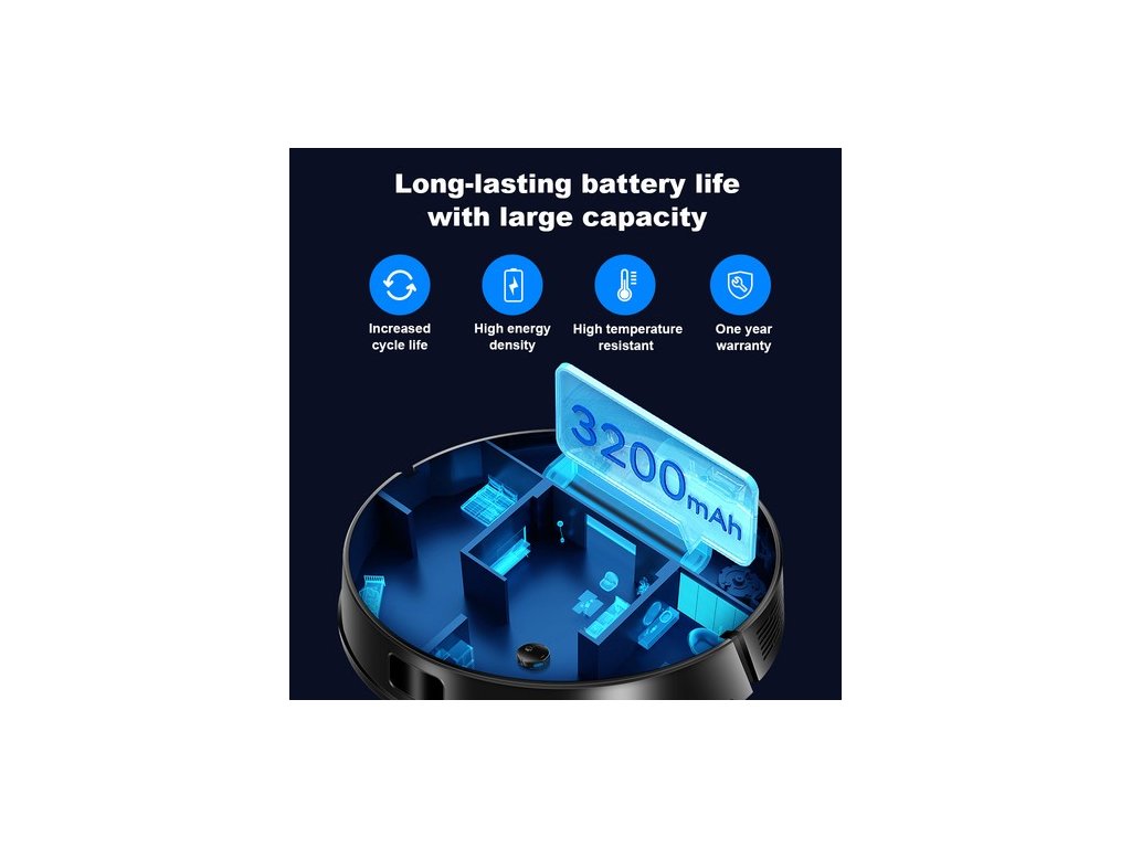 Az M70 Pro robotporszívó és felmosó kombináció hosszú, 110-175 perces akkumulátor-üzemidővel rendelkezik különböző szívási beállítások mellett, és a maximális tisztítási területe akár 2260 négyzetláb. (*A Liectroux laboratóriumunk számításai szerint az összetett otthoni környezetben némi eltérés lesz az akkumulátor élettartamában.) A robotporszívó automatikusan visszatér a töltőállomásra, ha az akkumulátor lemerül. Ha a takarítás nem fejeződik be, akkor automatikusan visszatér a töltéshez 80%-os töltöttségi szintnél, és a robot visszatér, hogy befejezze a takarítás hátralévő részét.