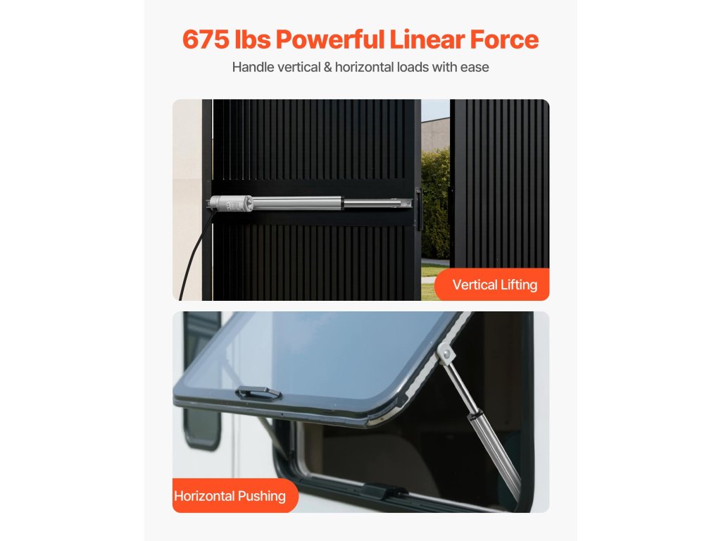 A VEVOR 12V-os lineáris működtető erőteljes, 675 font függőleges emelőerőt és vízszintes tolóerőt kínál, így számos közepes igénybevételű alkalmazás, például napelemes követőrendszerek, öntözőrendszerek, gépészeti berendezések vagy fűnyírók kezelésére alkalmas.