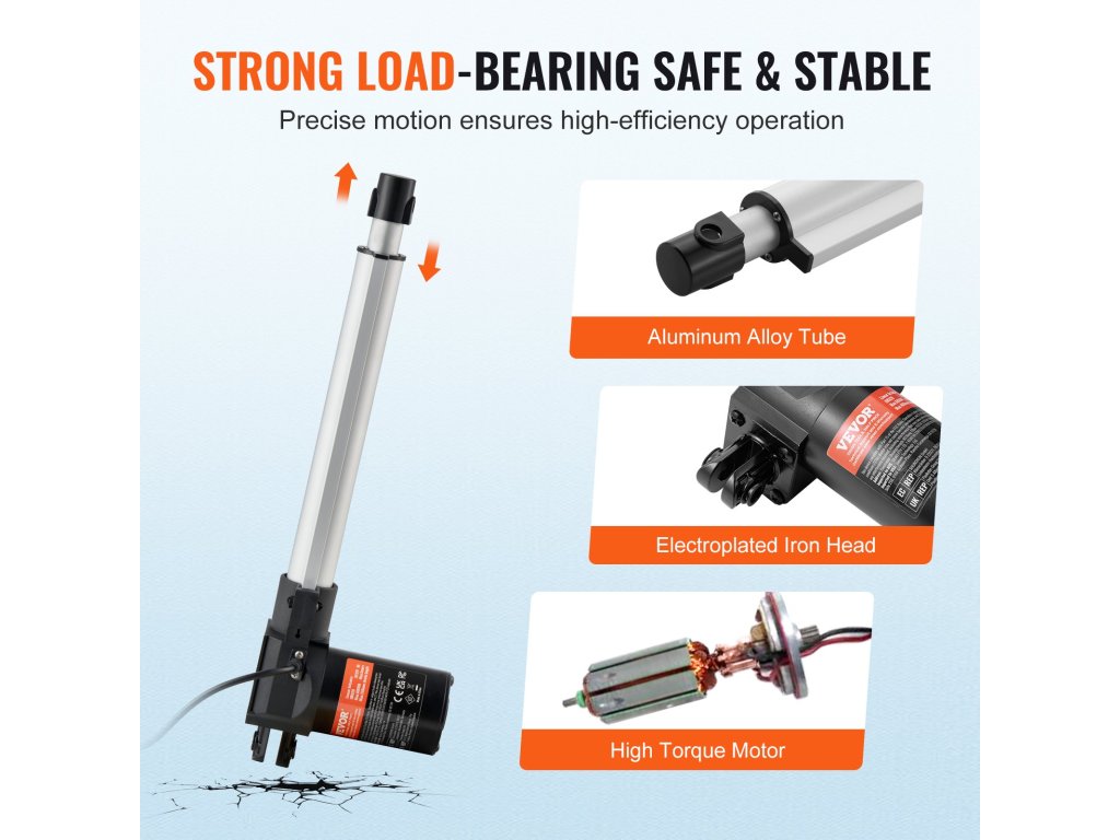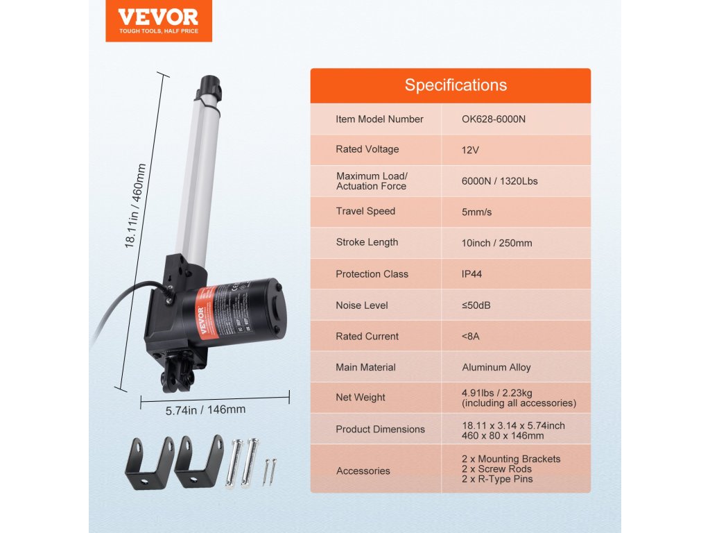 A 10 hüvelykes VEVOR lineáris működtetővel nehéz munkákat is elvégezhet. Pontos és stabil 0,19"/s mozgási sebességével és robusztus, 1320 font működtető erejével megbízható támogatást és hatékony mozgást kínál az ipari automatizáláshoz, a nagy teherbírású emelőrendszerekhez, a gépészeti berendezésekhez, a szállításhoz és sok máshoz.