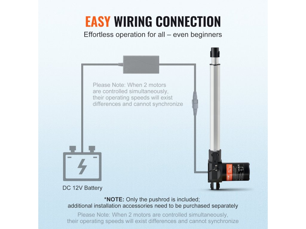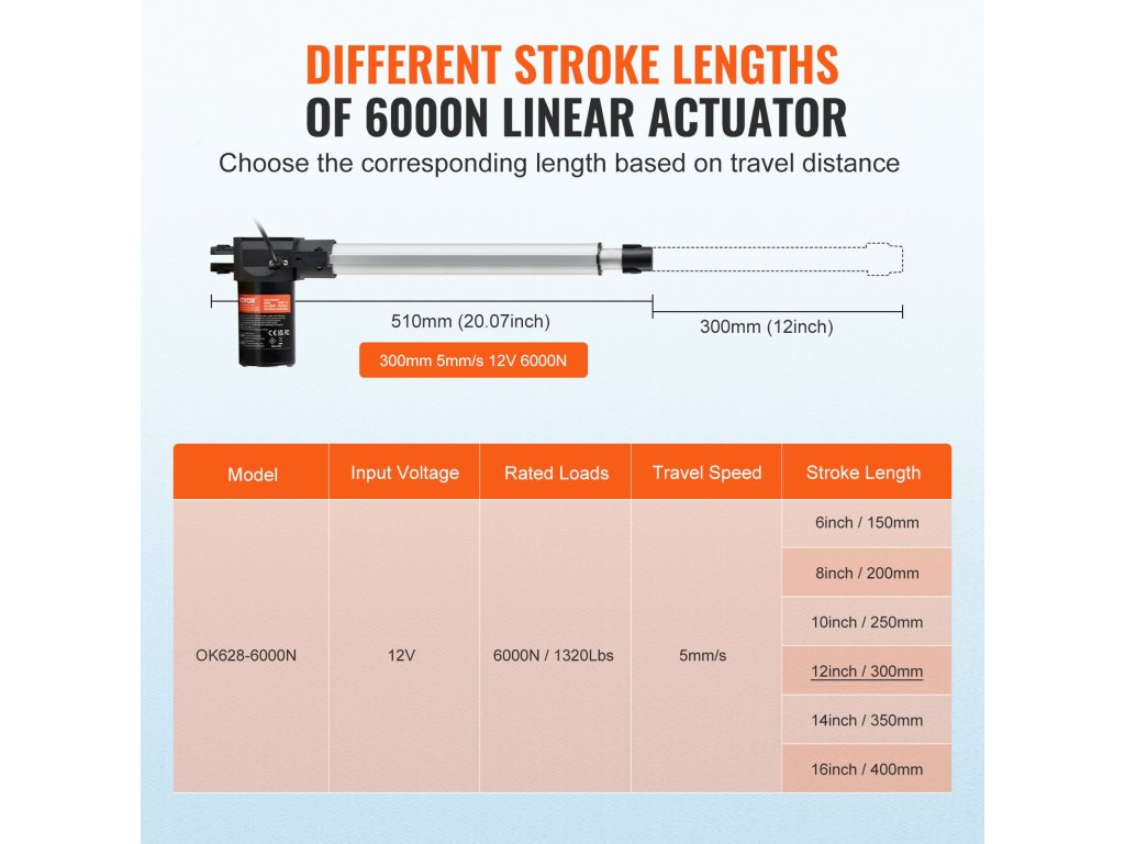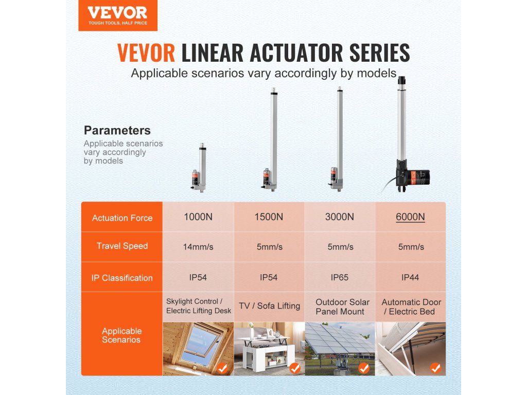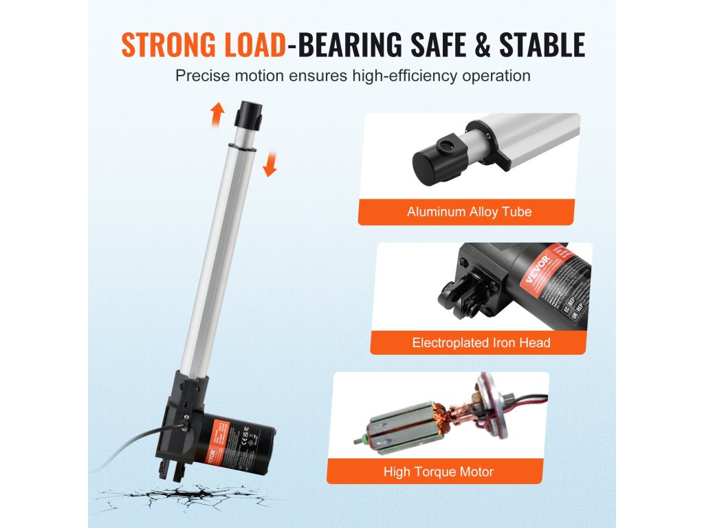 A 12 hüvelykes VEVOR lineáris működtetővel nehéz munkákat is elvégezhet. Pontos és stabil 0,19"/s mozgási sebességével és robusztus, 1320 font működtető erejével megbízható támogatást és hatékony mozgást kínál az ipari automatizáláshoz, a nagy teherbírású emelőrendszerekhez, a gépészeti berendezésekhez, a szállításhoz és sok máshoz.