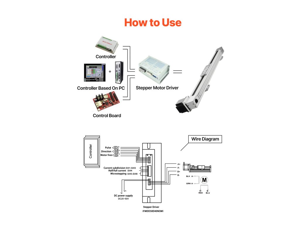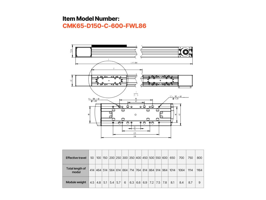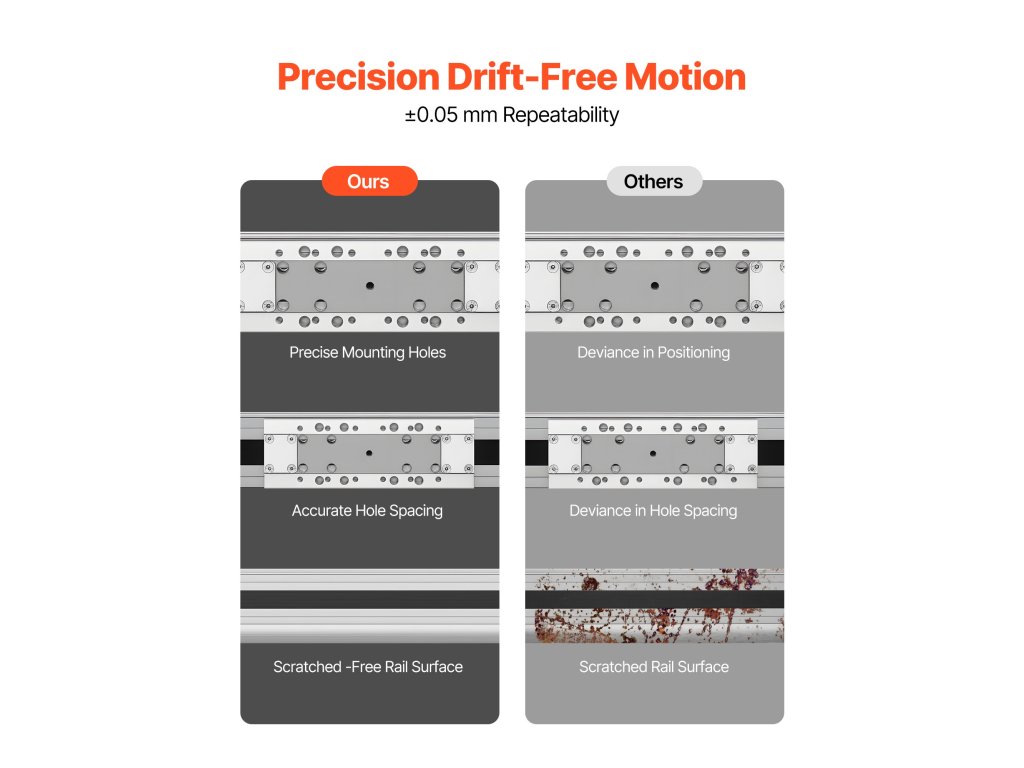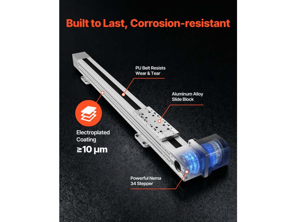 Tartalmaz egy CNC-vezetősínt 600 mm-es tényleges lökethosszal. PU szíjhajtással, precíziósan fúrt rögzítőfuratokkal és távolságokkal, valamint galvanizálással készült, ami biztosítja a csökkentett rezgést és a csendes működést. A léptetőmotor sima, hatékony mozgást biztosít elakadás nélkül.