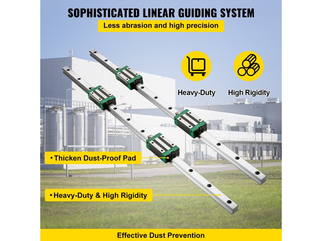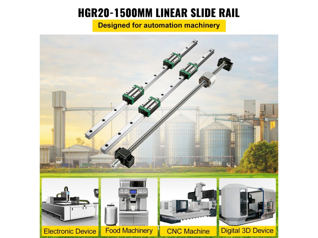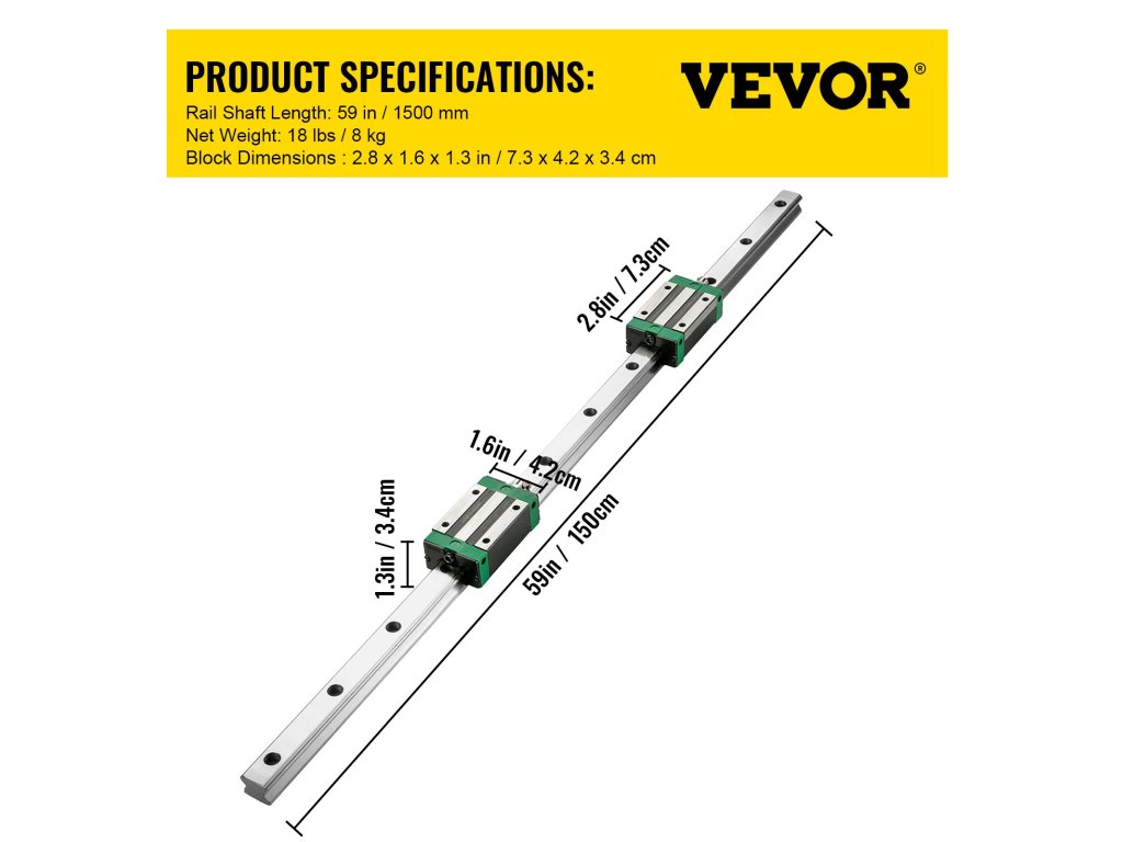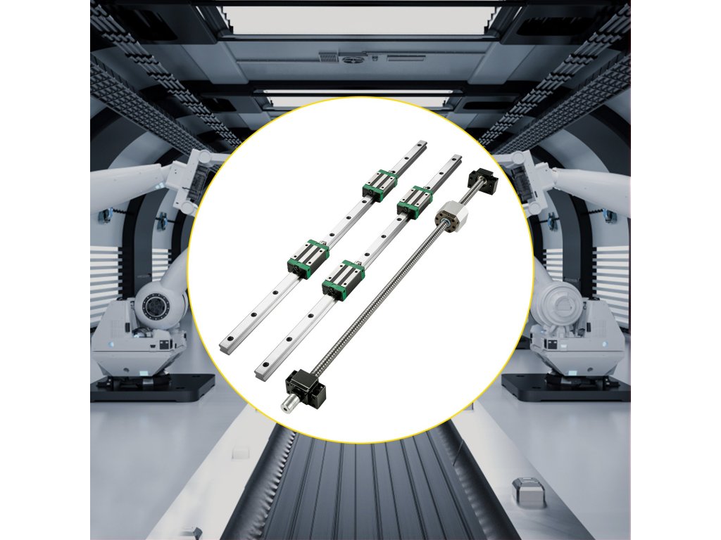 A lineáris vezetőkészlet 2 darab 1500 mm/59" hosszú HGR20 síntengelyt, 4 blokkot és egy golyóscsavar-készletet tartalmaz.