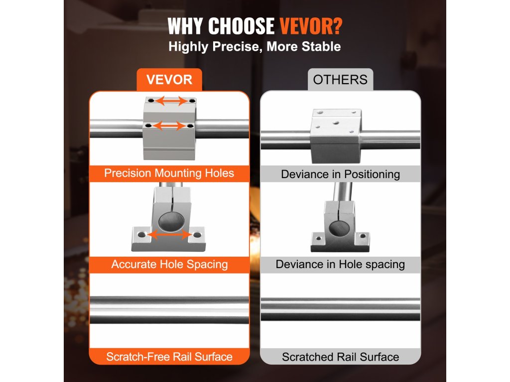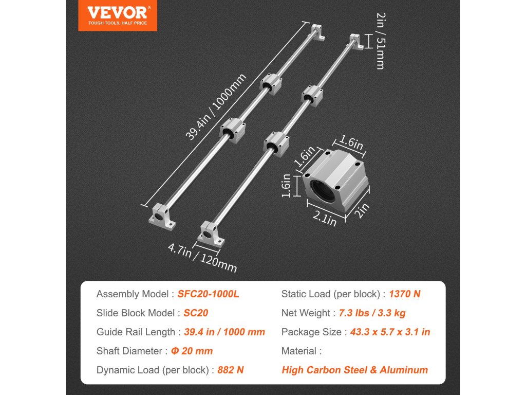 A VEVOR SFC lineáris vezetősín 2 vezetősínt és 4 csúszóblokkot tartalmaz. A tartós alumínium vezetősínek pontos átmérővel és furattávolsággal rendelkeznek, míg az SC csúszóblokkok golyóscsapágyakat használnak a sima és akadozásmentes mozgás érdekében. Többféle specifikáció áll rendelkezésre, hogy tökéletesen megfeleljen az Ön igényeinek.