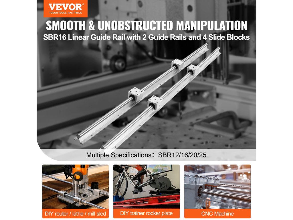 A kiváló minőségű VEVOR SBR lineáris vezetősín 2 vezetősínt és 4 csúszóblokkot tartalmaz. A tartós alumínium vezetősínek pontos átmérővel és furattávolsággal rendelkeznek, míg az SBR csúszóblokkok golyóscsapágyakat használnak a sima és akadozásmentes mozgás érdekében.