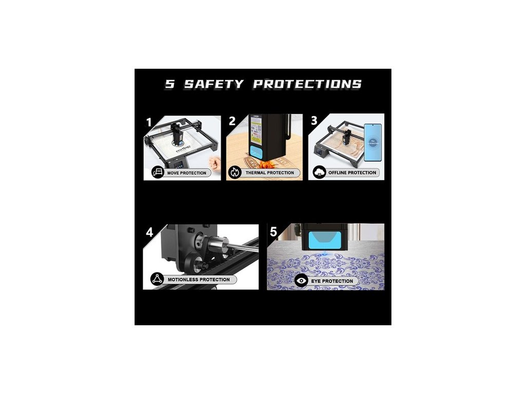 a RAY5 20W-os lézergravírozó gép védelmet nyújt a mozgás/hőmérséklet/áteresztés/mozgás/szemek ellen. A lézer lekapcsol, ha megdől, és ha lángot észlel, az adatkapcsolat megszakad és a lézerfej több mint 15 másodpercre lefagy. Ezenkívül a panoráma szűrőüveg hatékonyan szűrheti a lézert, így biztonságosabbá teszi a használatát.