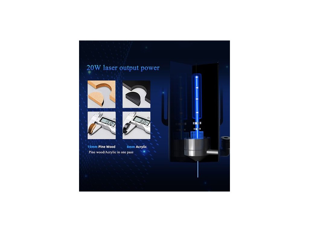 A hosszabb 20 W-os RAY5 lézergravírozó a legnagyobb teljesítményű négymagos diódalézert használja a gravírozáshoz és vágáshoz, amely 0,05 mm-es rozsdamentes acéllemez, 10 mm-es hársfa, 15 mm-es fenyő és 8 mm-es akril vágására alkalmas.