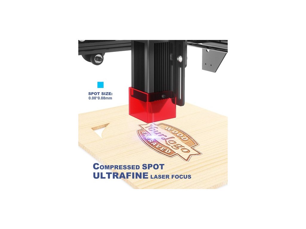 Ez a lézergravírozó a legújabb FAC lézertechnológiával van felszerelve a tömörített lézerpontokhoz, a pont mérete 0,08 * 0,08 mm; minél kisebb a pont mérete, annál koncentráltabb az energia. Ez sokkal erőteljesebbé teszi a gravírozást vagy a vágást. A lézermodul kimeneti teljesítménye eléri az 5-5,5W-ot.