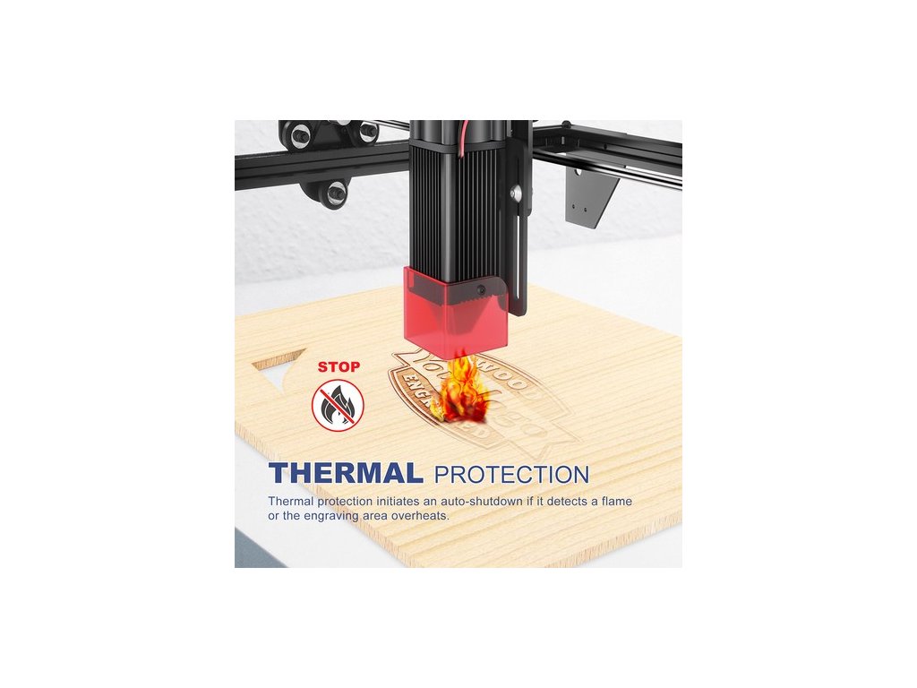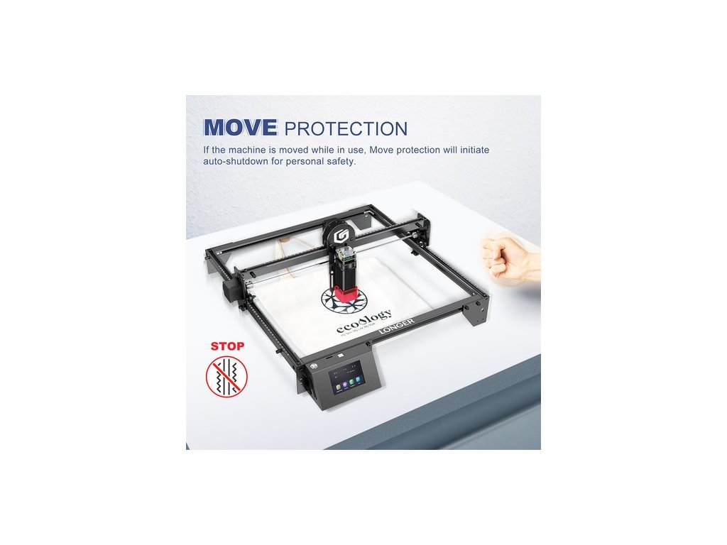 A LONGER RAY5 mozgásgátló és hővédelmi funkciókkal rendelkezik. Ha a gép használat közben elmozdul, a mozgásgátló automatikus leállást indít el a személyi biztonság érdekében. A hővédelem automatikus leállást kezdeményez, ha lángot vagy a gravírozási terület túlmelegedését észleli.